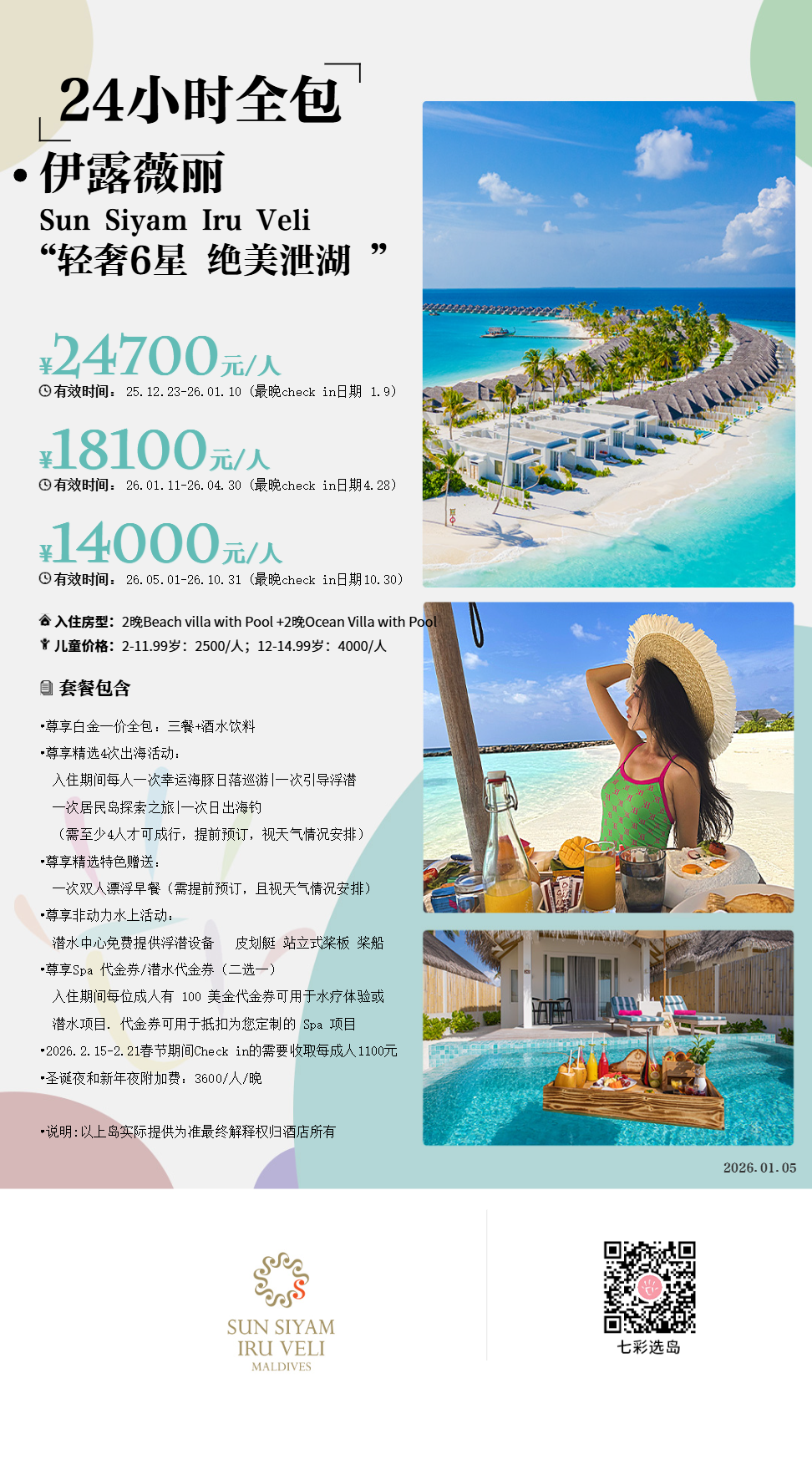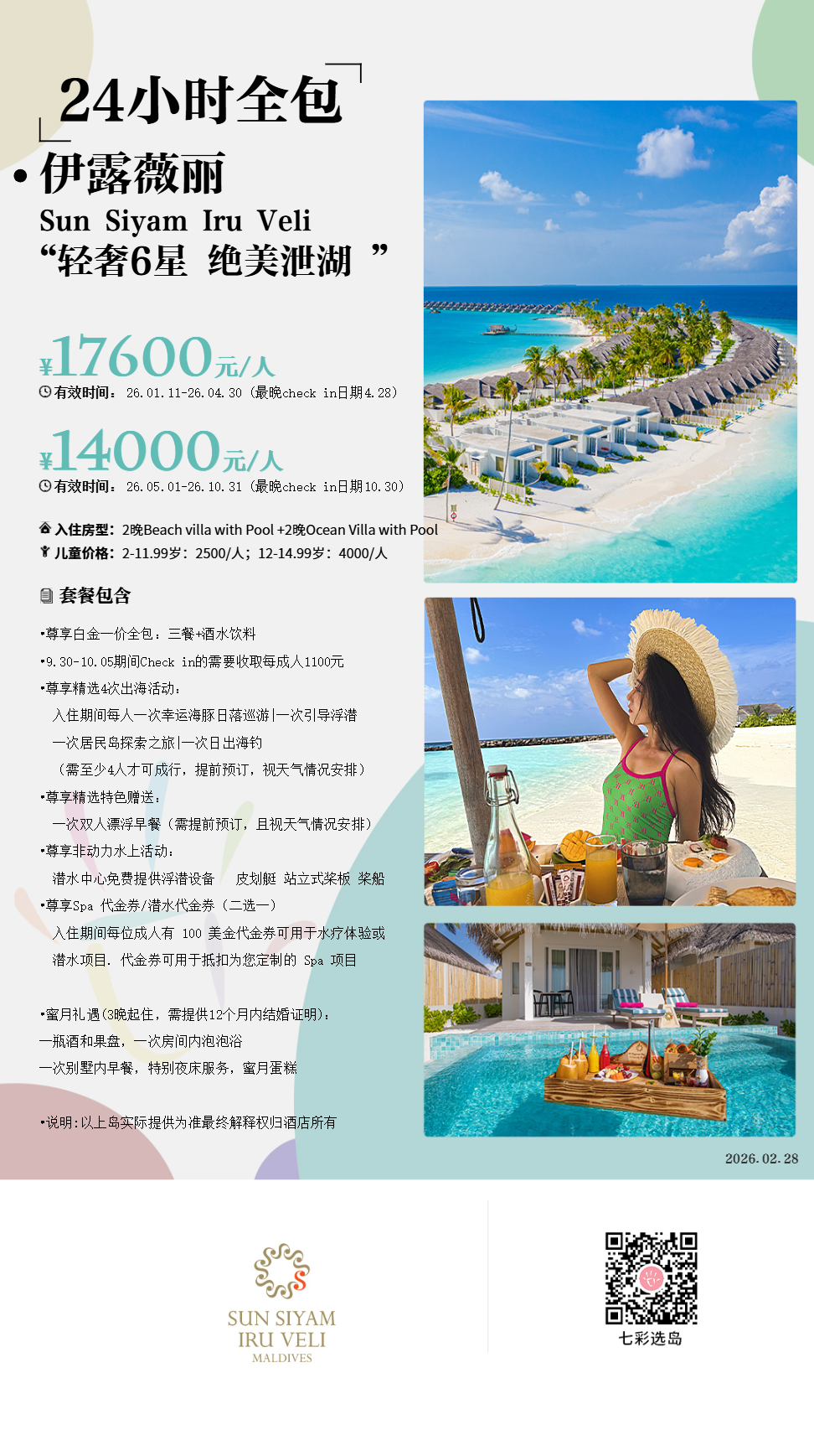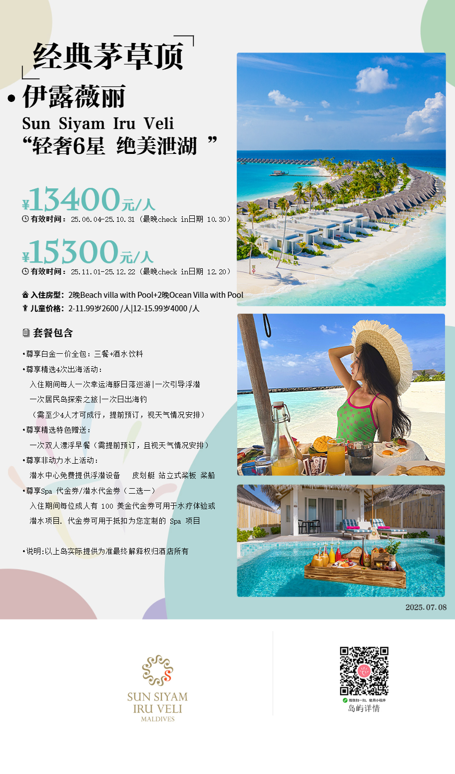 马尔代夫伊露薇丽Sun Aqua Iru Veli,是大名鼎鼎的SUN集团在马尔代夫最奢华的度假村,一价全包(SSP)酒店。曾经不接待儿童专属蜜月岛,2022年开始允许接待儿童。作为SUN集团第四家度假村拥有最佳泄湖,乘坐水上飞机35分钟即可到达。岛上总共125栋别墅,设施整体较新,均为轻奢时尚风,茅草屋顶搭配丰富的的色调非常出片,并且全部房型均带私人泳池。因为属于一价全包计划,三餐和酒水均包含了,针对中国市场也非常用心,经常赠送漂浮早餐和出海活动,是一家非常省心的度假村。日出房型距离海沟较近可以进行有限的浮潜,日落房型是泄湖美景。