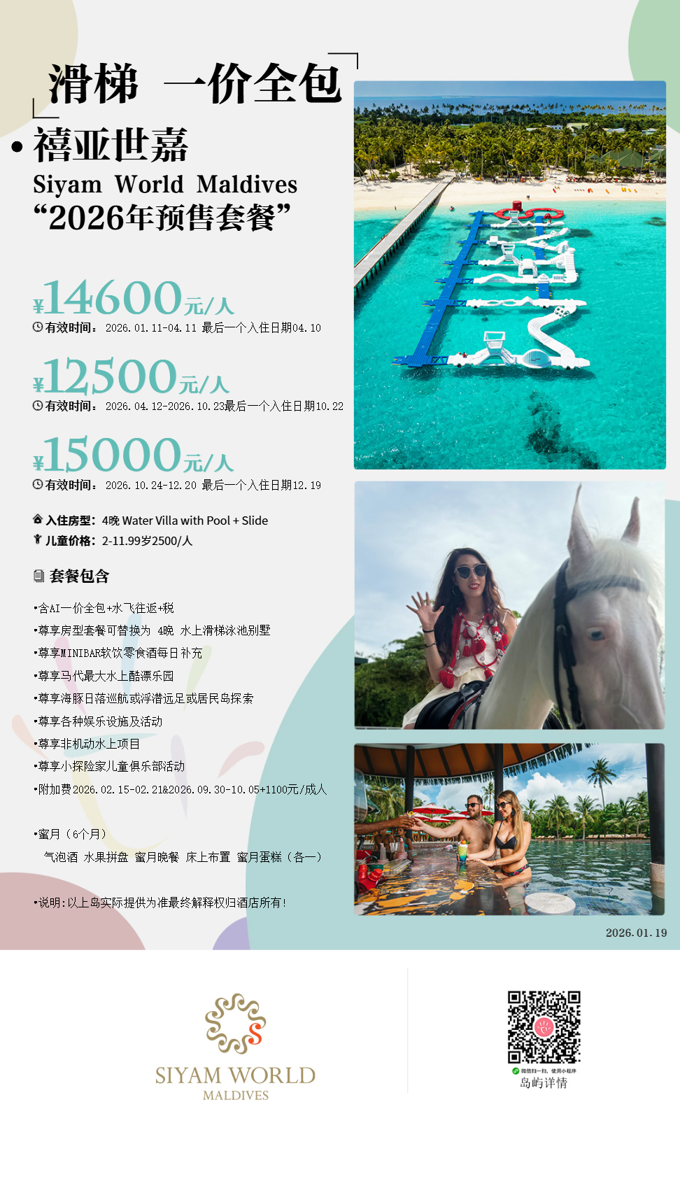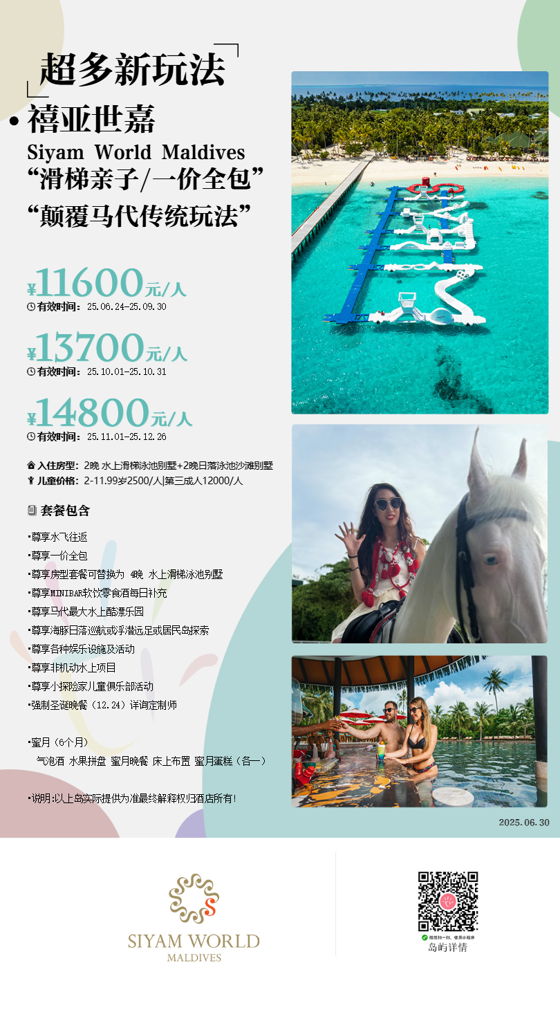 马尔代夫禧亚世嘉Siyam World Maldives,是诺鲁环礁乃至马代最大的原生岛屿,全岛覆盖茂密的椰子林、细腻的白沙滩、原始的内环礁‘白雪’潜水点。曾经是邻居白马庄园、索尼娃贾尼青睐的无人岛。也差点改造为内陆机场,因需大肆砍伐椰林和马尔代夫环保初衷不符,经过岛主西亚姆多年坚持不懈的努力,终于开发成为可持续型度假村。而SUN集团对于这个新岛雄心勃勃,还在不断完善,终究会颠覆马尔代夫新玩法。岛屿面积巨大,拥有499间别墅,总计21种房型,所有水上别墅均带私人泳池,除了“Water Villa with Poll”这一个没有面向亚太地区的基础水屋以外,其他水屋全带海上滑梯。另外,除了少量双卧稀缺房型以外,整个度假村走亲民路线,差价不大,让每一位上岛的客人感受到平易近人,没有负担。24小时白金一价全包,9个餐厅、6个酒吧,颠覆了只限定主餐厅的基础全包模式,一日三餐、甚至每日下午茶、客房迷你吧、用餐期间和酒吧酒水软饮、各式洋酒、啤酒、鸡尾酒、葡萄酒,甚至赠送多个出海活动。总之,禧亚世嘉只要你的预算适合,喜爱滑梯水屋,这一定是一座让全家人省心玩乐的岛屿。