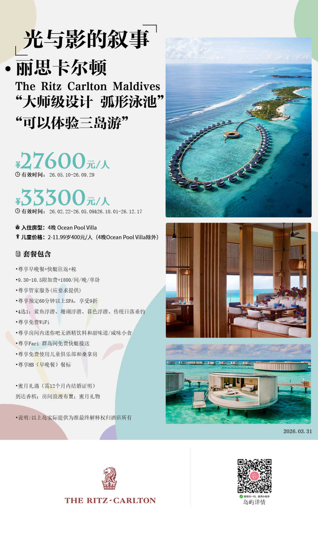 活动介绍:法里群岛,包括柏典、嘉佩乐、丽思卡尔顿、居民岛,旁边还有一个游艇荟,愿意的话度假村乐意提供效劳。