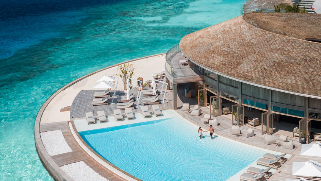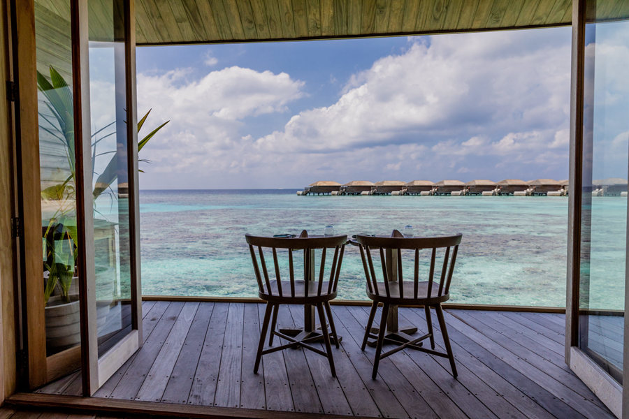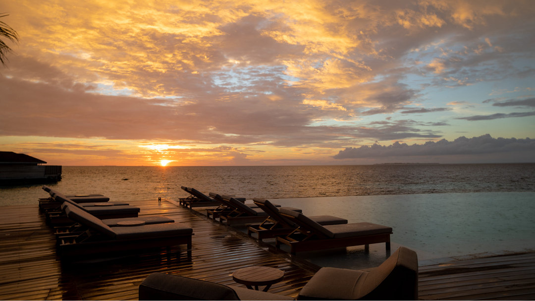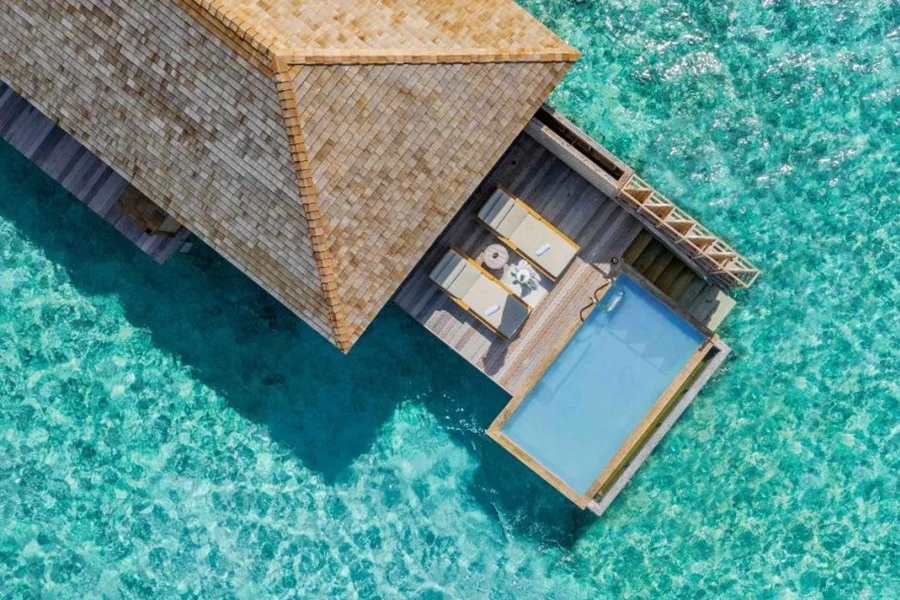 房型介绍:海洋泳池别墅拥有壮丽的海景。 别墅空间宽敞舒适,设有水上甲板和私人无边泳池。 蓝绿色的海洋在阳光下波光粼粼,温柔的海浪轻轻拍打,成群的热带鱼惬意地穿梭在灵动的珊瑚礁之间。 在甲板上尽情享受马尔代夫的阳光,欣赏脚下这个巨大的天然水族箱,这,就是海洋泳池别墅的乐趣所在。