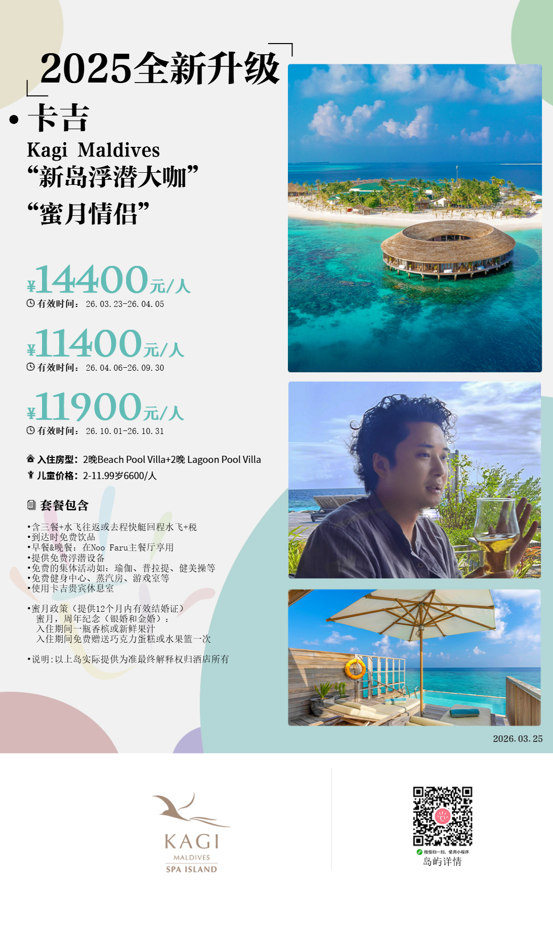 活动介绍:卡吉岛是您完美的蜜月之地。 晶莹剔透的海水,白色的面粉沙滩,一排排的棕榈树点缀其中。在卡吉岛,时间缓慢流逝,为您创造专属的蜜月记忆。 我们的Kagi Memories照相馆拥有专业的摄影师团队,为您提供优质的摄影服务,捕捉您的完美瞬间,创造终生难忘的回忆。