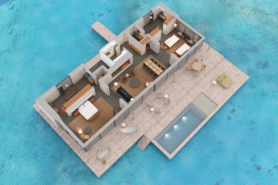 房型介绍:和基础水上泳池别墅布局面积一致,不过全部朝西,拥有极致的海上日落盛景。超大的开间让整个壮丽海景进入室内视线,大甲板上有浴缸和吊床。