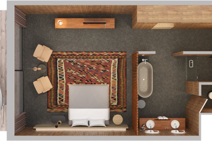 房型介绍:避难所式设计,充分尊重自然,拥有艺术画廊、社会市场。在这里,社会和环境意识通过旅行者的链接和碰撞得到发现,团聚给人性不断的发展和创造力。俯瞰原生热带植物和蓝绿色的泄湖,激发我们工作室的设计,而Fari滨村,公寓式工作室就是灵感的中心。