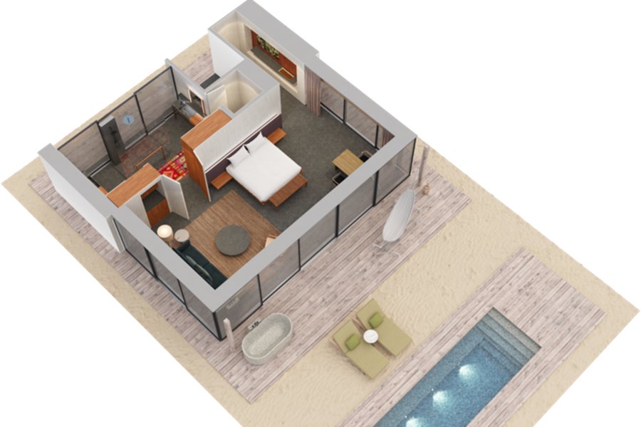 房型介绍:和普通一卧室泳池沙滩别墅面积设施一模一样,不过日落房型位于岛屿西面,甚至躺在床上就能看印度洋壮丽的日落。
