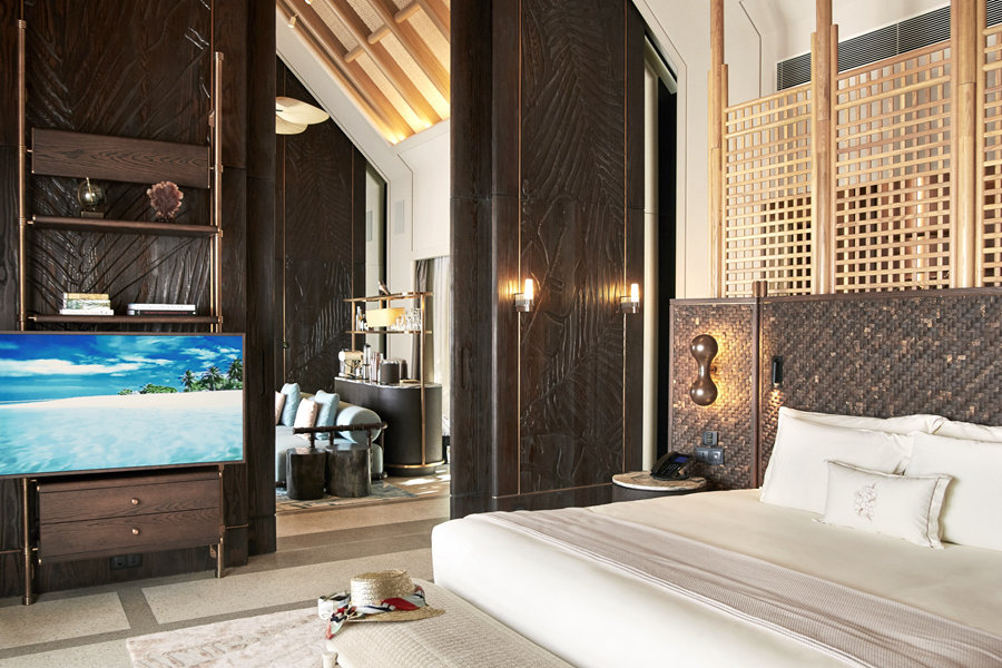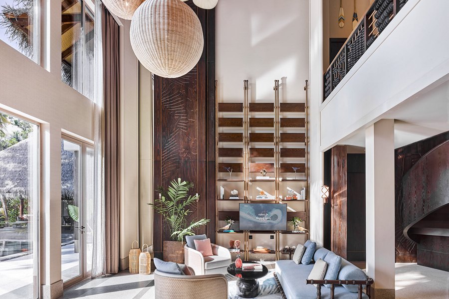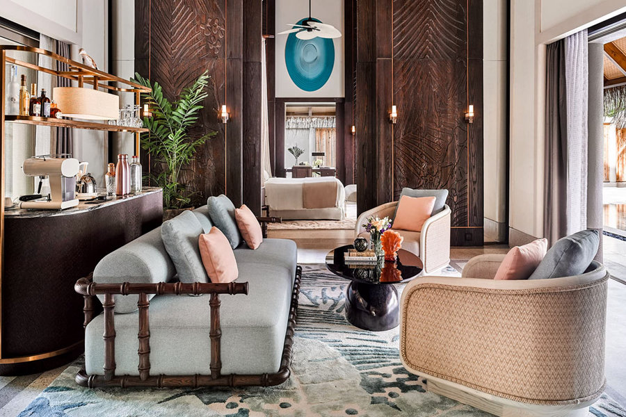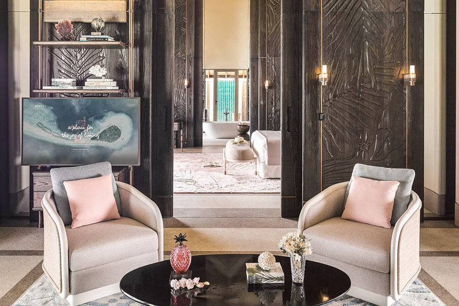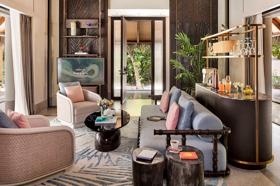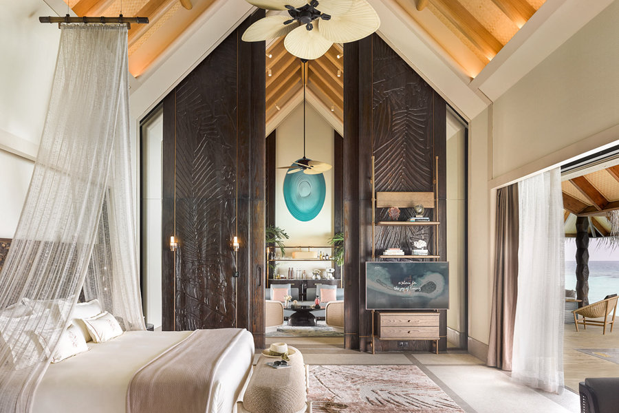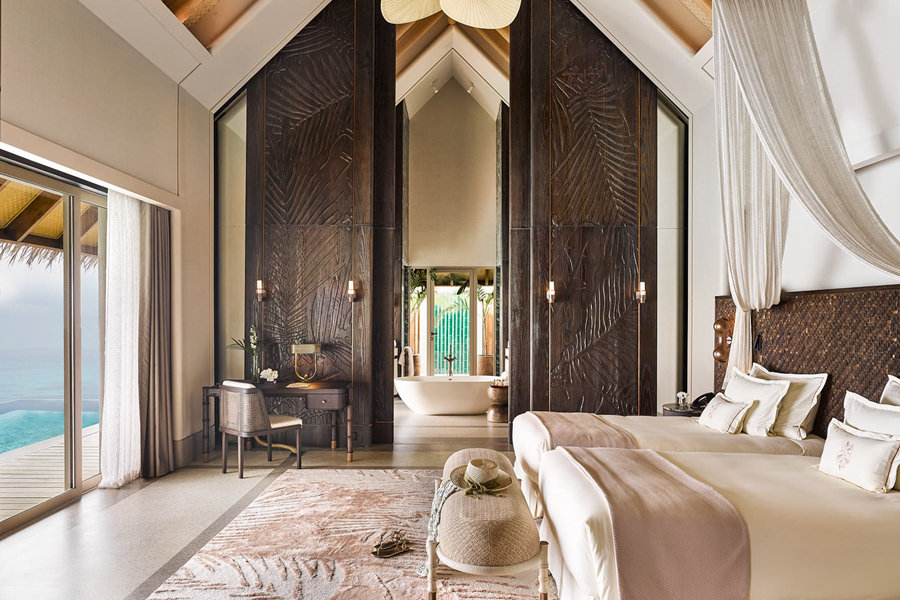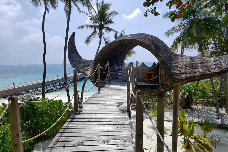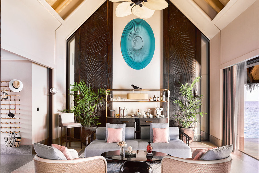 马尔代夫娇丽Joali Maldives,乘坐水上飞机40分钟或者内陆飞机转快艇55分钟即可到达。度假村由白马设计师操刀,所以常常被誉为“小白马”。相对于姐妹岛娇丽Being,娇丽的设计和色彩更为“浓妆艳抹”,犹如埃及艳后的寝宫,贵妇人一般。主打女性,马卡龙主色调,超高层高,无处不彰显宫殿和艺术的结合。洗漱用品欧舒丹系列,就连睡袍都是真丝日式风格,曾经多少人“顺走”这一物件,现在改为棉布材质。岛屿有一个很长的沙滩拖尾,随着潮起潮落顺着水屋一线若隐若现,犹如丝带。相较于娇丽Being,这儿接待儿童,拥有完善的儿童设施,适合家庭度假。无处不在的艺术,如果你是才女你一定要来娇丽,如果你想提高审美,更要来娇丽。