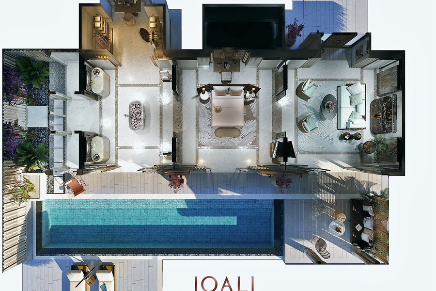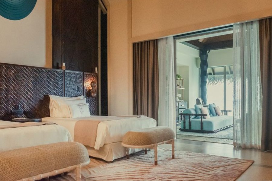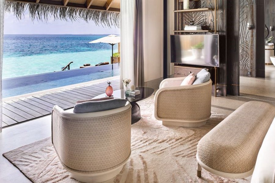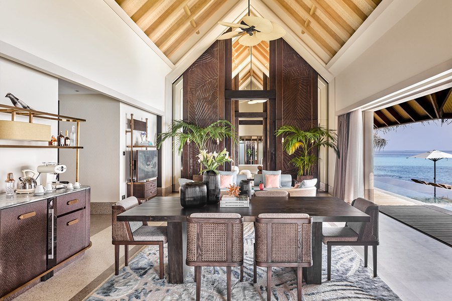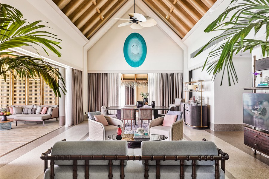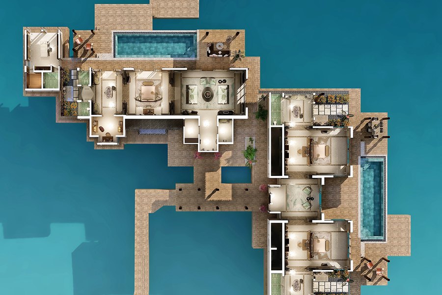 房型介绍:我们超级水上住宅的时尚休息室。两个无限大的游泳池,三间卧室和不间断的海景确保每一天都充满欢乐和活力。并且既合二为一,又能保证相互的隐私。