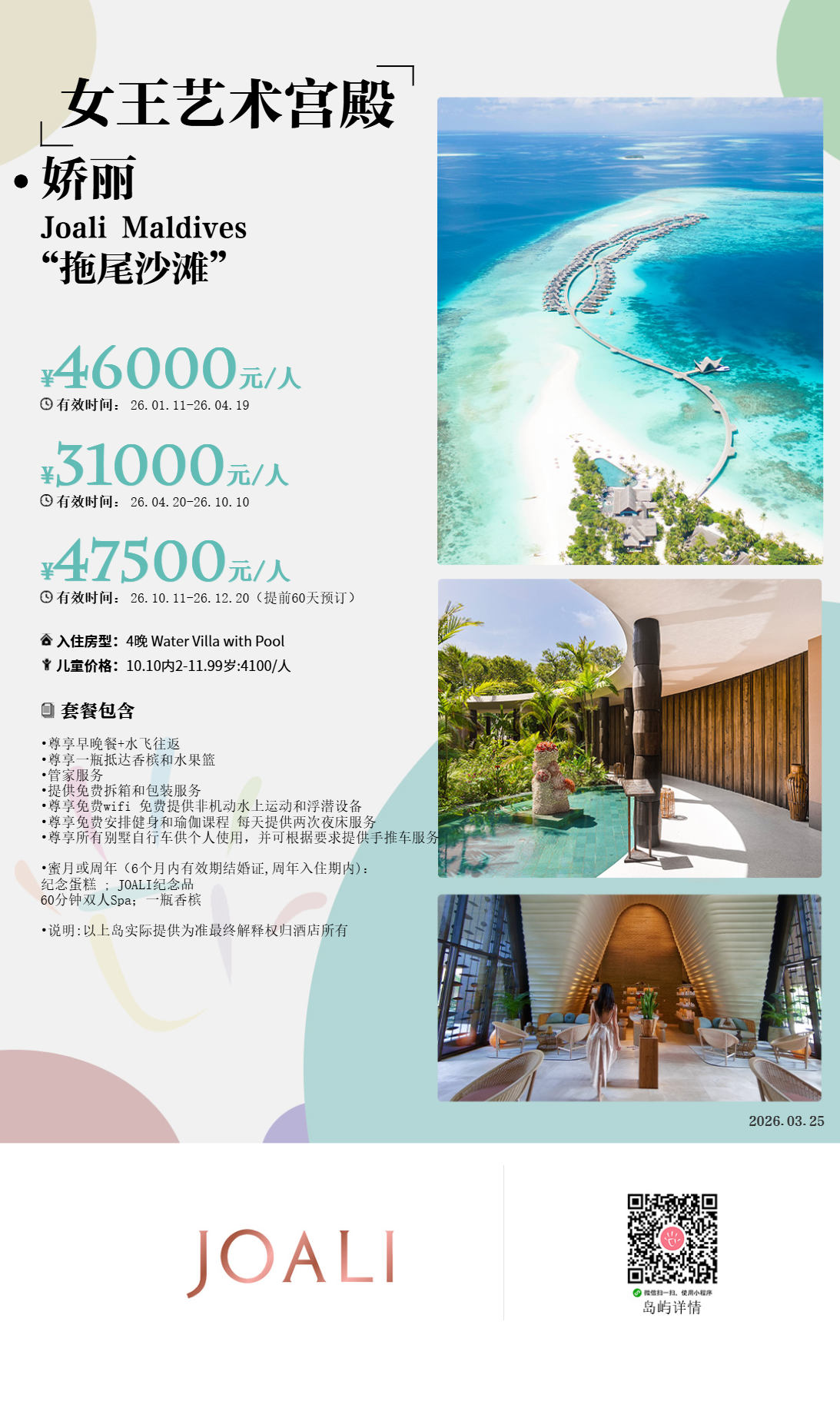 活动介绍:在 JOALI,我们的传统就是要让每一对幸福的夫妇拥有独特的假期。分享你的想法,让你的想象变成现实。让我们来处理一切,让你们带着平和的心态和喜悦步入你们的新生活。