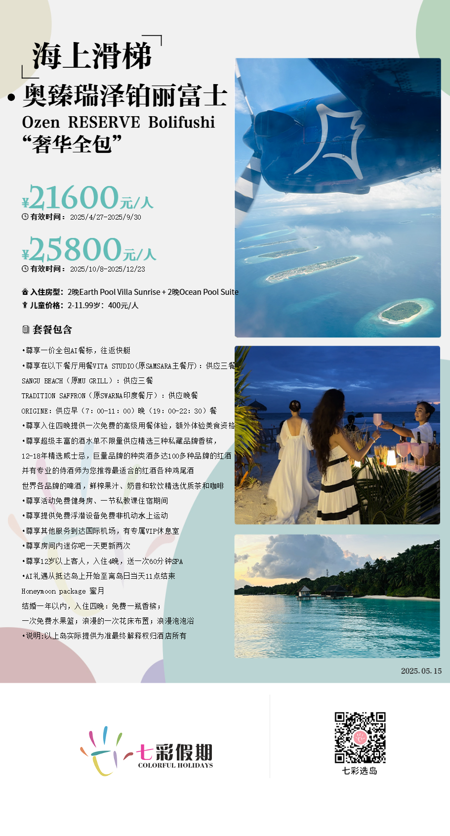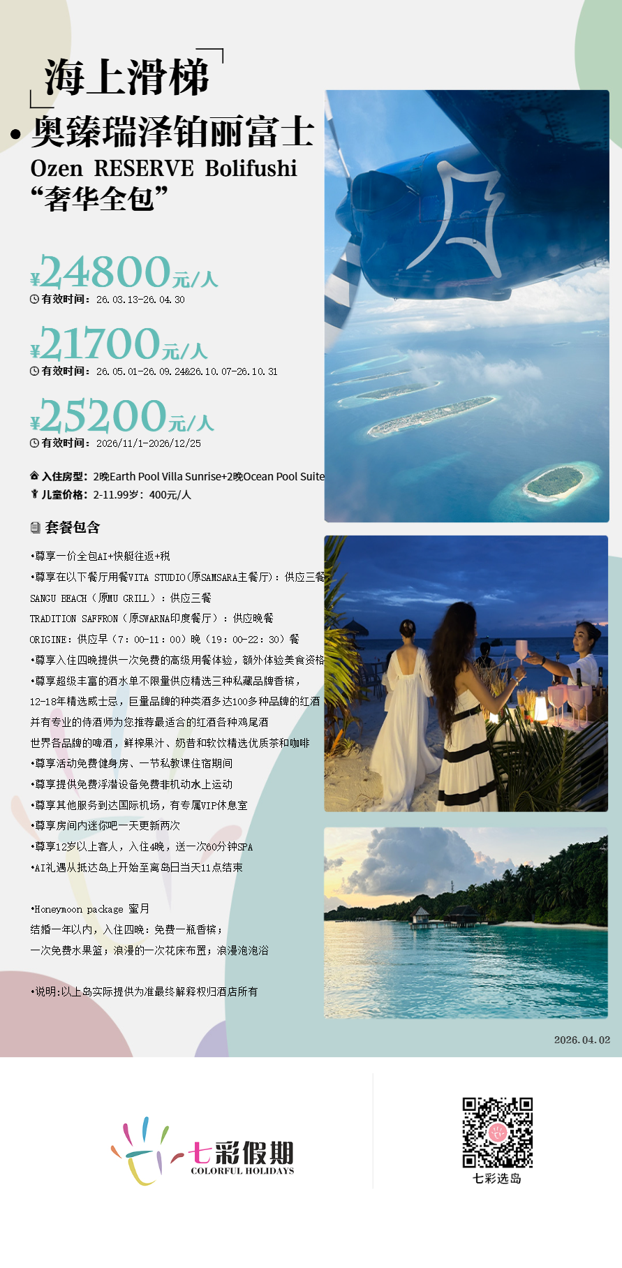 马尔代夫奥臻瑞泽 Ozen Reserve Bolifushi,岁月不败美人,年久不败奥臻,由新的LOGO出发,重新了解艾茉菲尔。位于南马累环礁,乘坐20分钟豪华双体游艇即可到达。曾经是鼎鼎大名帆船酒店“卓美亚酒店集团”在马尔代夫的旗舰度假村“马尔代夫卓美亚维塔维利”,也就是各位小伙伴俗称的JV岛,妥妥的准7星标准。被艾茉菲尔集团收购以后成为旗下在马尔代夫的第六家度假村,并且华丽的升级为一价全包。众所周知奥臻瑞泽·铂丽富士最大的特色就是它超大的滑滑梯水屋,其实传奇并不止于此,热带溜冰场,最小的沙滩别墅室内外面积也达到了惊人的400多平,综合属性极高。