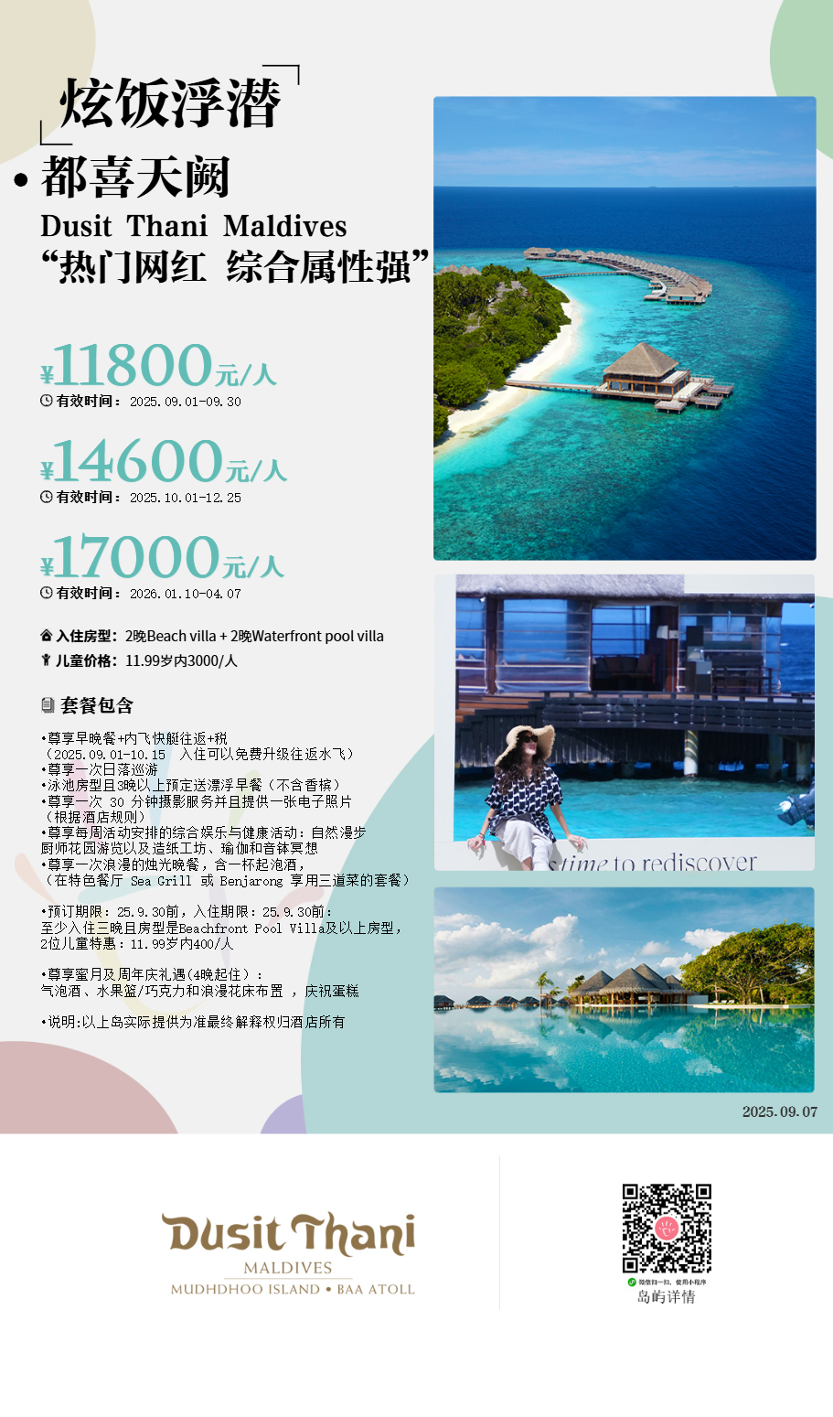 马尔代夫都喜天阙Dusit Thani Maldives,从2012年开业至今一直是热门网红度假村。位于马尔代夫Baa环礁的Mudhdhoo岛距离马累机场123公里,可乘坐水上飞机约35分钟或乘坐内陆飞机25分钟转乘快艇10分钟即可到达。国际认证的绿色度假村,希望之光项目、绿色基金计划和微笑行动,承载了度假村对社会责任和环境保护的理念。位于马尔代夫联合国教科文组织认定的生物圈保护区内,酒店围绕着360度珊瑚礁及丰富的海洋生物。五星级PADI和第一家自由潜水中心相结合,为水下世界爱好者提供独特的体验。泰式的热情款待提供真实和传统的泰式体验,招牌泰国餐厅供应皇家泰式美食,每一家旗下酒店都拥有此招牌餐厅。都喜的招牌豪华Devarana Spa可在树顶水疗舱辖区内享受各种护理或按摩。