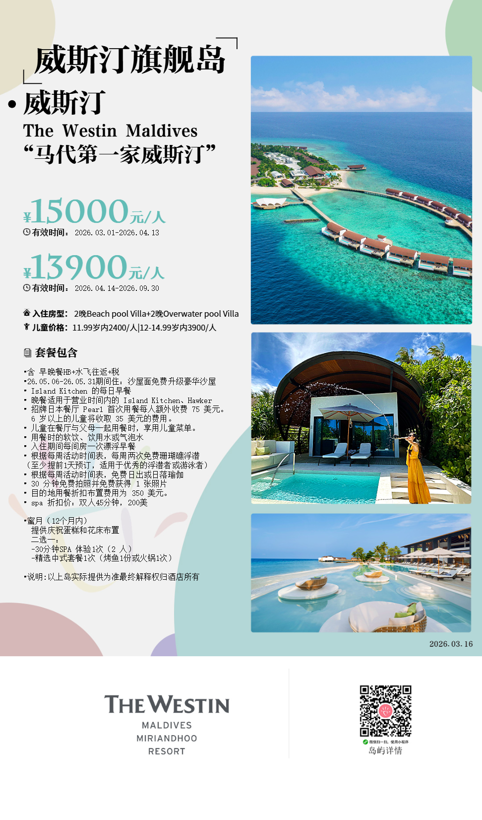 活动介绍:诗情画意的度假酒店内设有威斯汀天梦水疗中心,提供威斯汀特色品牌水疗服务。天梦水疗中心坐拥海洋全景,拥有先进的面部护理创新技术,设有宽敞的双人护理套房和按摩池。水疗中心区域采用匠心设计,洋溢着静谧安宁的氛围。威斯汀天梦水疗中心秉持我们度假酒店的健康理念,旨在通过各种技艺让宾客全然放松身心,重焕感官活力。