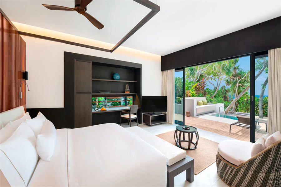 房型介绍:140㎡的沙屋房型,确实是相当宽敞了。独具威斯汀风格的沙滩泳池别墅,房型设计舒适高级,所有内部装饰用料考究,形成天然的舒适感,别墅带有私人泳池,随着泳池一眼望去是令人窒息的漂亮印度洋海景。
