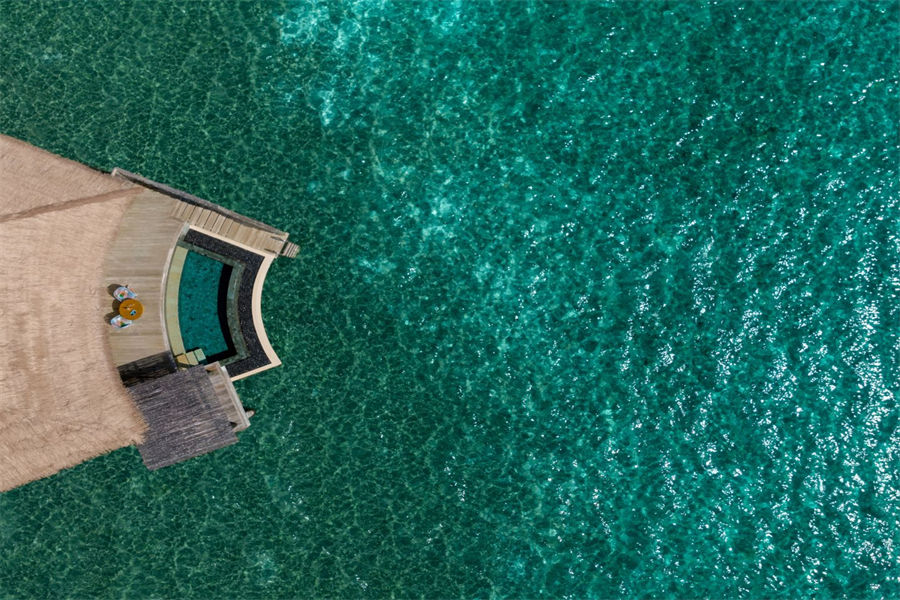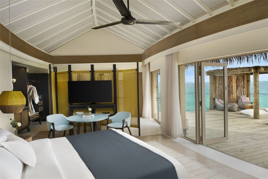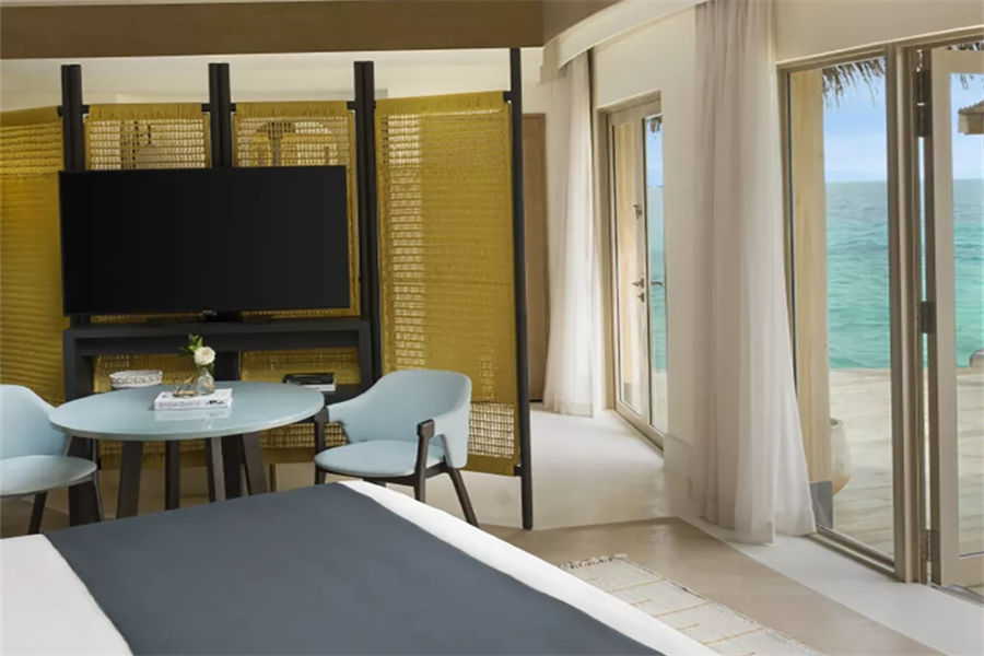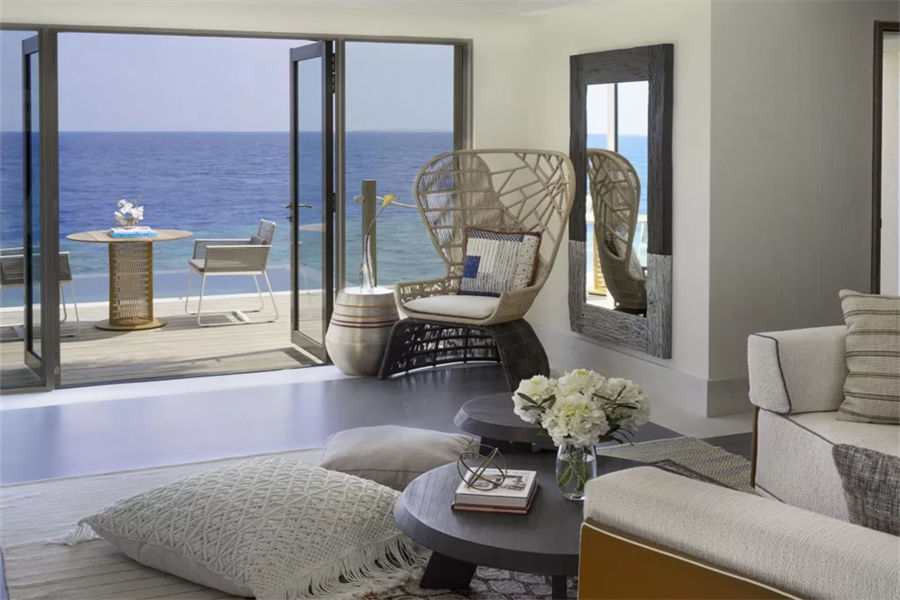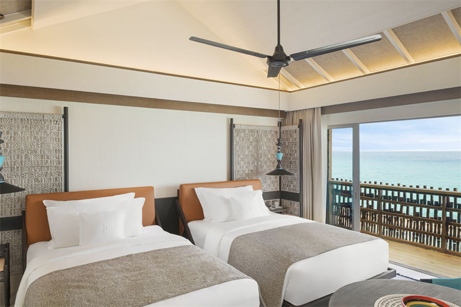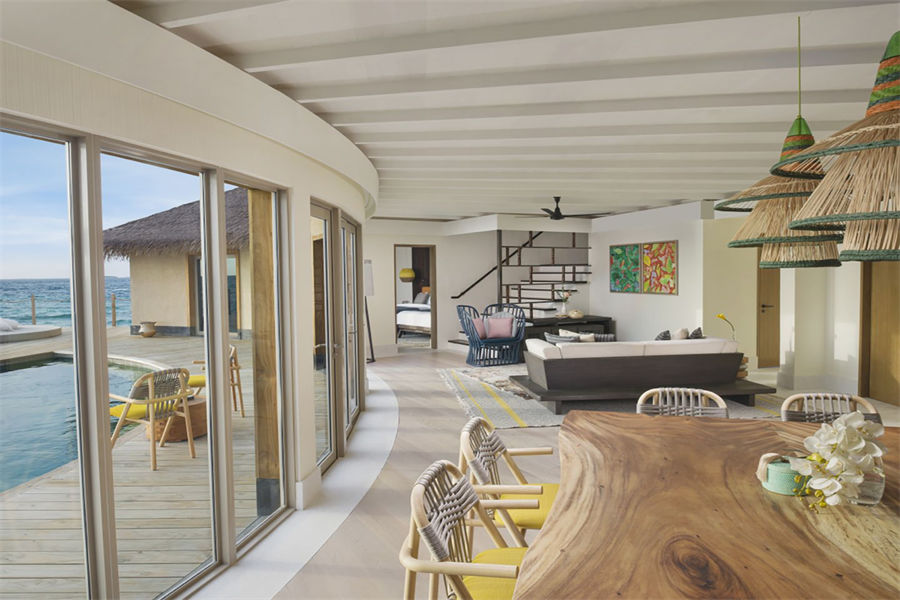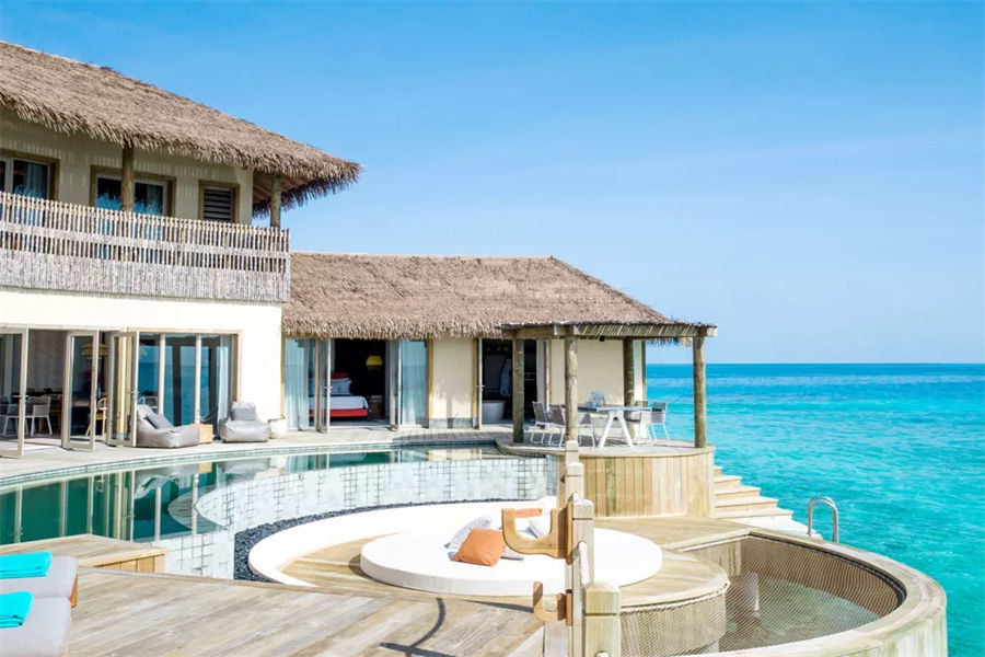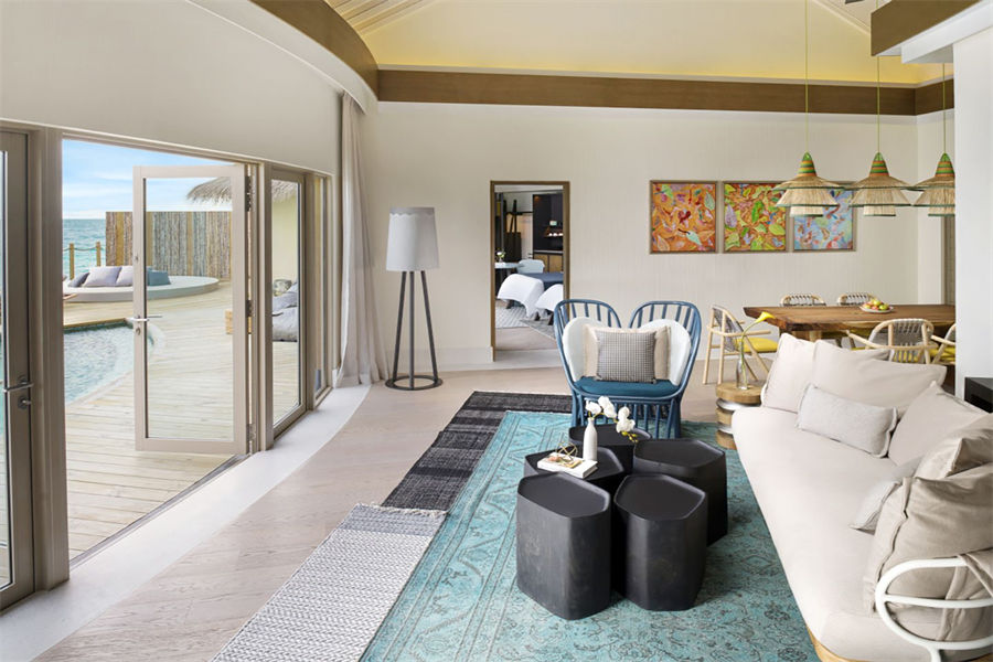 房型介绍:两居室水上住宅全岛仅2栋,俯瞰着蓝海,通向广阔的户外甲板,可以沐浴阳光,台阶直接通向大海;非常适合情侣或朋友一起旅行。拥有两间卧室、一张特大号床和两张双人床、两间连接浴室、宽敞的起居和用餐区、一间餐具室和化妆室、带露天起居和用餐亭的私人无边泳池,从所有房间都可以欣赏到不间断的地平线美景。(12岁以下的小朋友不支持入住)