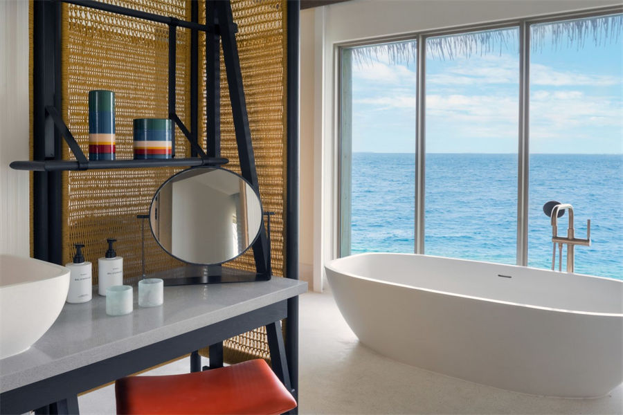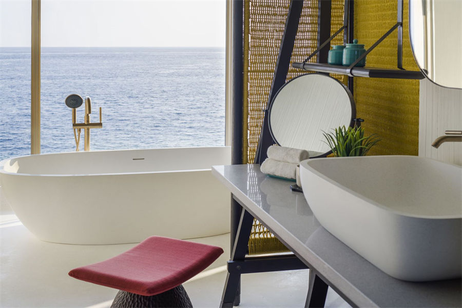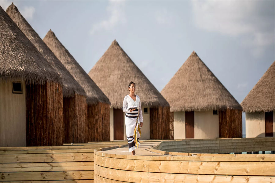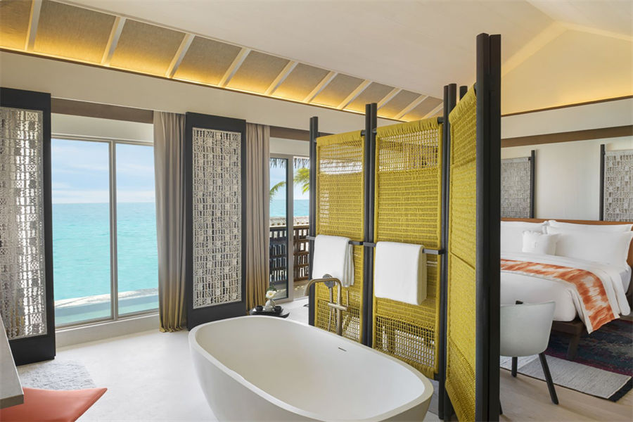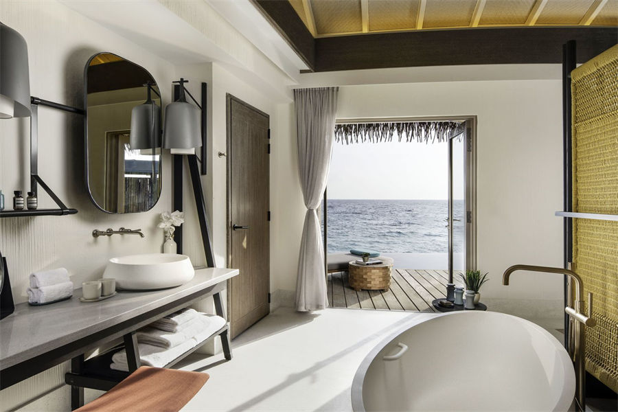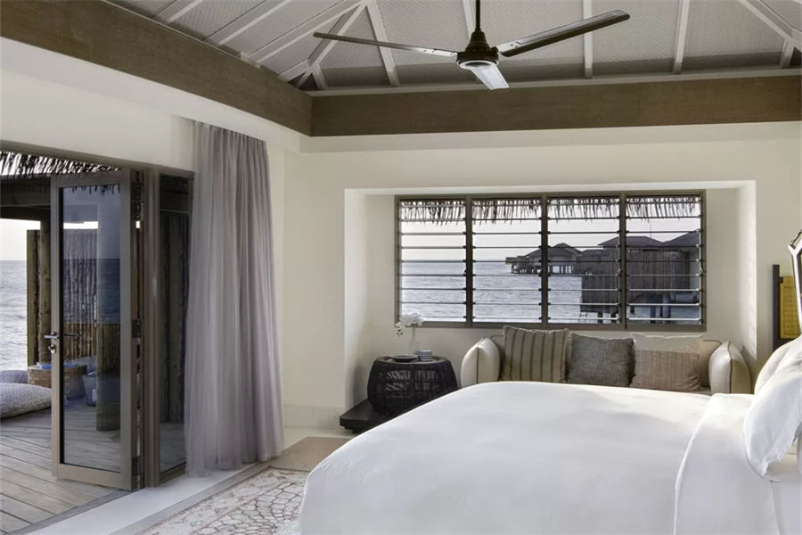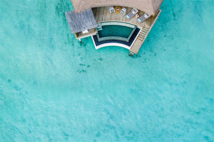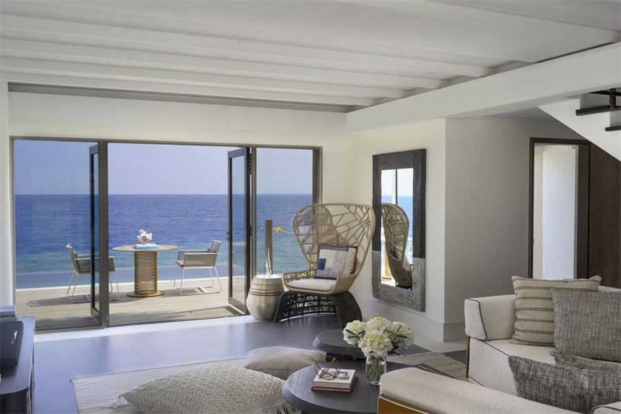 房型介绍:两居室水上住宅全岛仅2栋,俯瞰着蓝海,通向广阔的户外甲板,可以沐浴阳光,台阶直接通向大海;非常适合情侣或朋友一起旅行。拥有两间卧室、一张特大号床和两张双人床、两间连接浴室、宽敞的起居和用餐区、一间餐具室和化妆室、带露天起居和用餐亭的私人无边泳池,从所有房间都可以欣赏到不间断的地平线美景。(12岁以下的小朋友不支持入住)