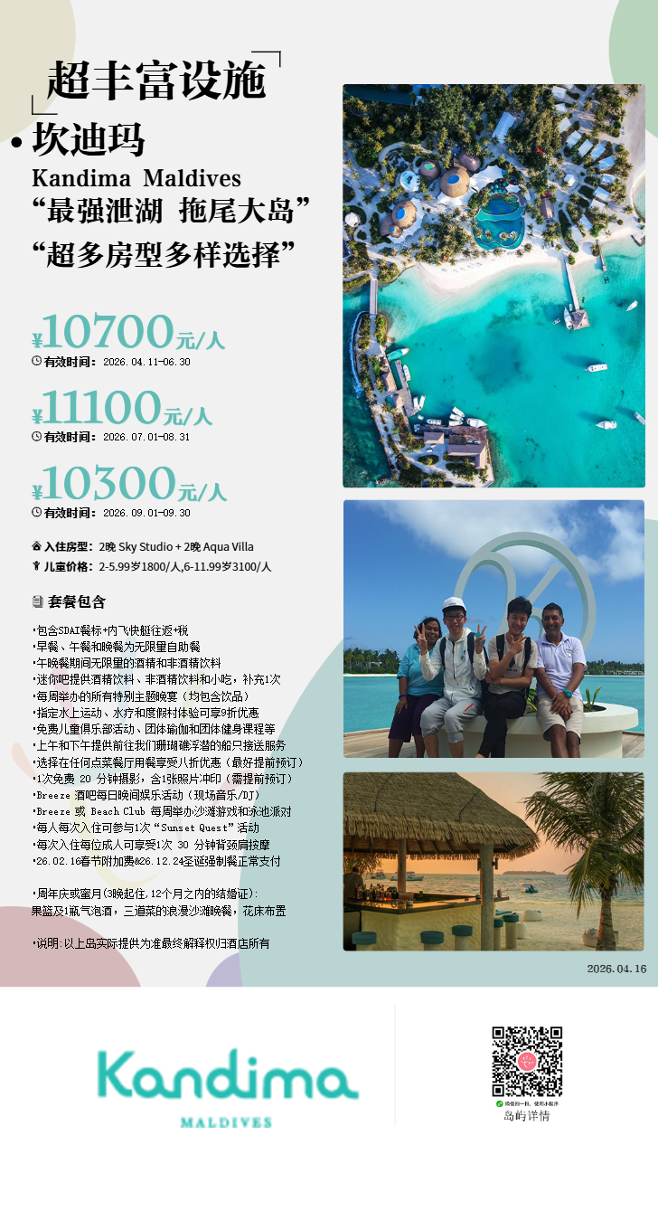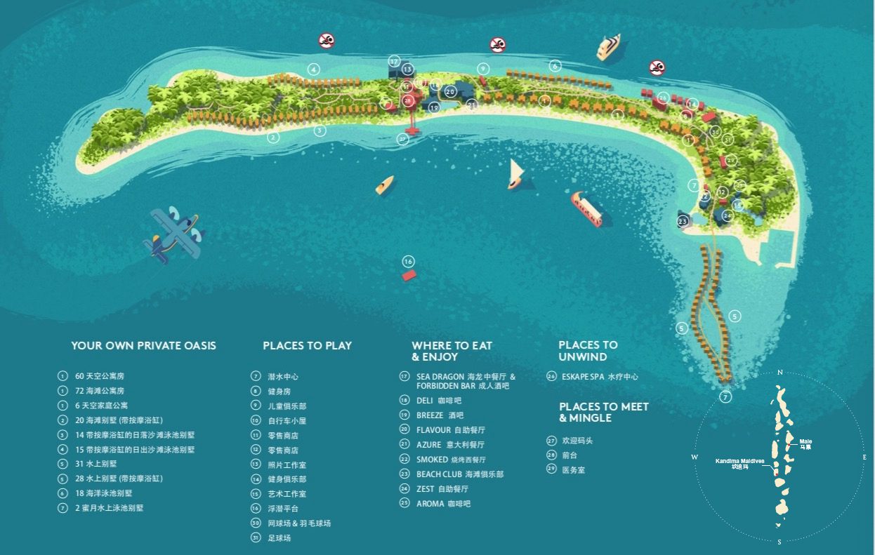 马尔代夫坎迪玛Kandima,40分钟水飞或30分钟内飞搭配20分钟快艇即可抵达。和大名鼎鼎的库拉玛蒂岛屿非常相似,属于超大型度假村,拥有海量的房型和硬件设施。岛上免费提供自行车、24小时干洗服务、摄影工作室、烹饪教室、PADI潜水学校、海洋生物中心、瑜伽 、 网球场 、 篮球场、驻岛医疗救护、儿童俱乐部。Kandima将为宾客呈现引人入胜的“全新马尔代夫”,这座生活方式度假村承载着马尔代夫一切积极向上的元素,同时体现其自身创新、鲜活和洒脱的格调,为马尔代夫注入焕然一新的风貌。由于岛屿是个巨无霸,甚至连航拍图都无法拍摄出一张完整的俯瞰照片。而基础的公寓房型拉低了价格,适合小团队或者公司出行。