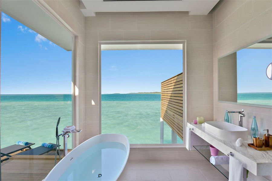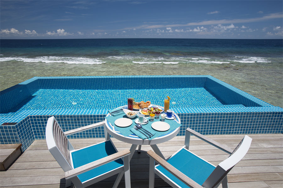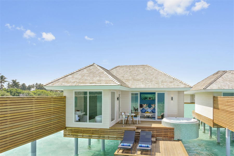 房型介绍:带按摩浴缸的水上别墅没有私人泳池,但有按摩浴缸,可供追求极致体验的人所使用。同时别墅内设有带躺椅的私人日光甲板、日光浴室,以及拥有Kandima泻湖广阔完美景致的浴室。保证您每日可获取到充足的“海洋维生素”。