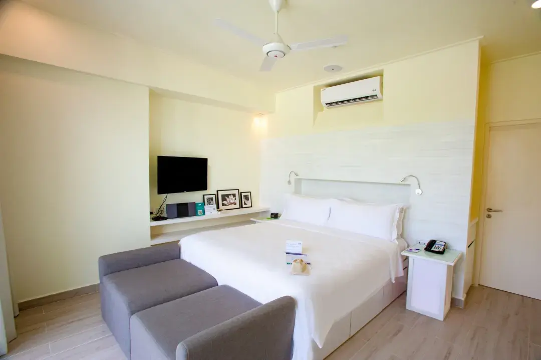 房型介绍:全岛44栋的沙滩别墅,面积为48㎡。走进您的海岛隐居之地,感受自然环绕的环境、几步之外的白沙滩和迷人的湛蓝海水。康杜玛度假村为您提供的海滩别墅宽敞舒适,让您尽情享受放松的私密空间。别墅配有完备的现代设施和服务,包括室外露台和吊床以及室外淋浴。