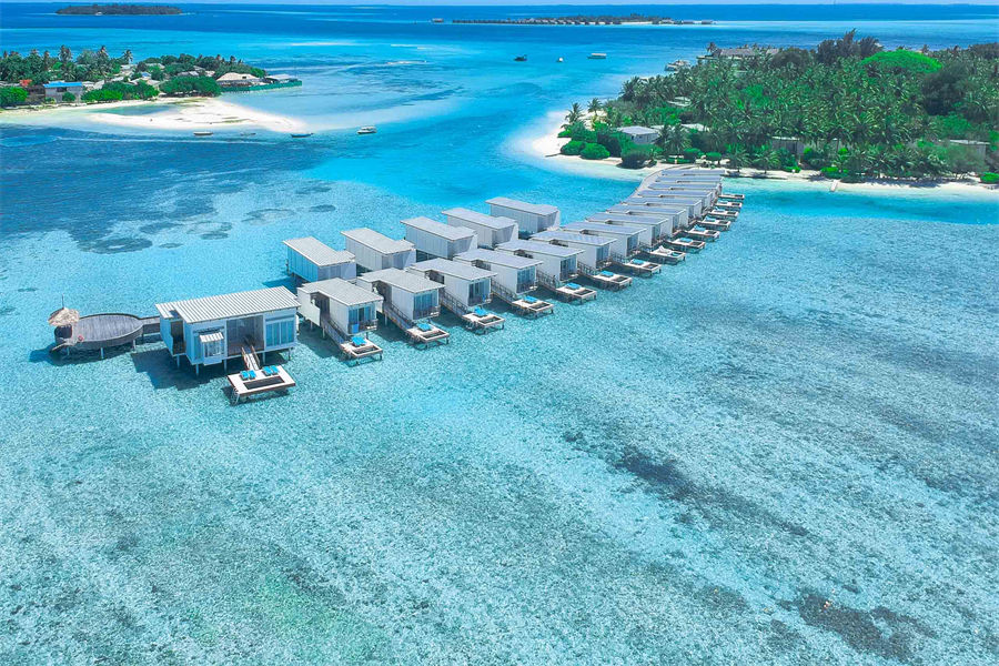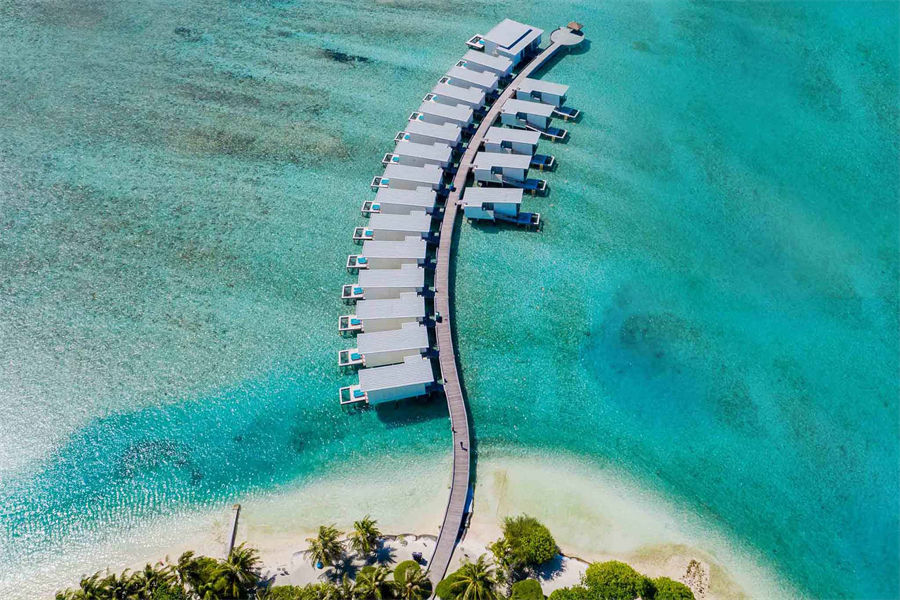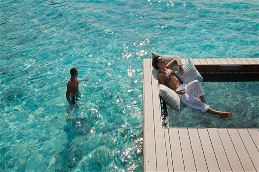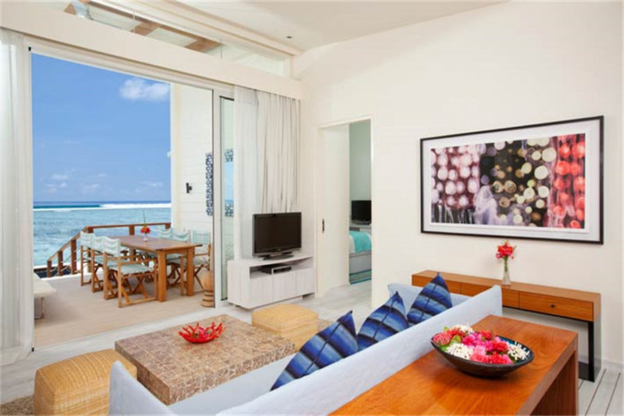 房型介绍:全岛仅1栋的双卧水上阁,面积为170㎡。踏入印度洋海水之中,或在水上吊床上闲躺,或在日光浴床上享受夏日阳光。我们宽敞的水上别墅是家庭出游的理想之选,设有两间卧室、两间浴室、室内起居室,还有开放淋浴设施与日光浴阳台齐全的户外空间。