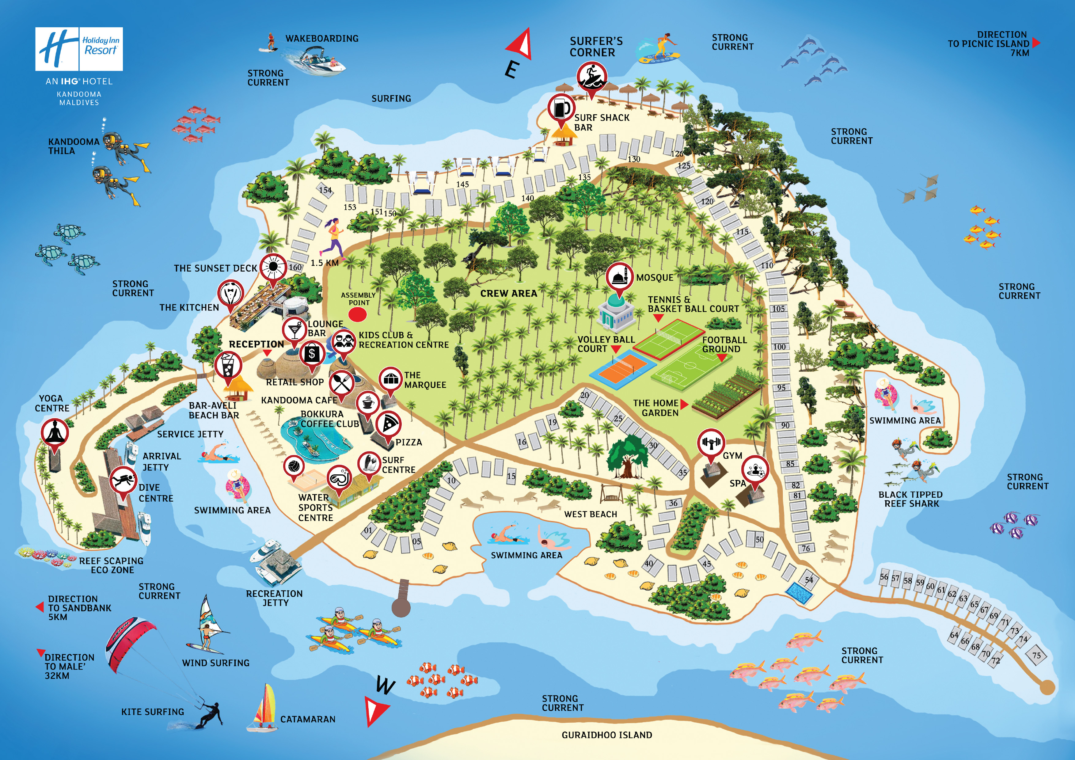康杜玛Holiday Inn Resort Kandooma Maldives,是假日酒店旗下的五星度假岛。该岛临近康杜玛海峡、洞穴和海底山石等专业潜水的绝佳地点。时尚风格与自然环境的完美结合,使它成为马尔代夫最受年轻人欢迎的小岛。岛上的设施简洁贴心,房间以白色为主色调,与海景的色彩搭配得十分巧妙。节日气氛常年不断。这里没有奢华的装饰,却处处洋溢着生机。纯白色调的装修、覆盖全岛的无线网络,都是吸引年轻情侣的亮点。岛上提倡“乐活”生活方式,意为以健康及自给自足的态度生活。