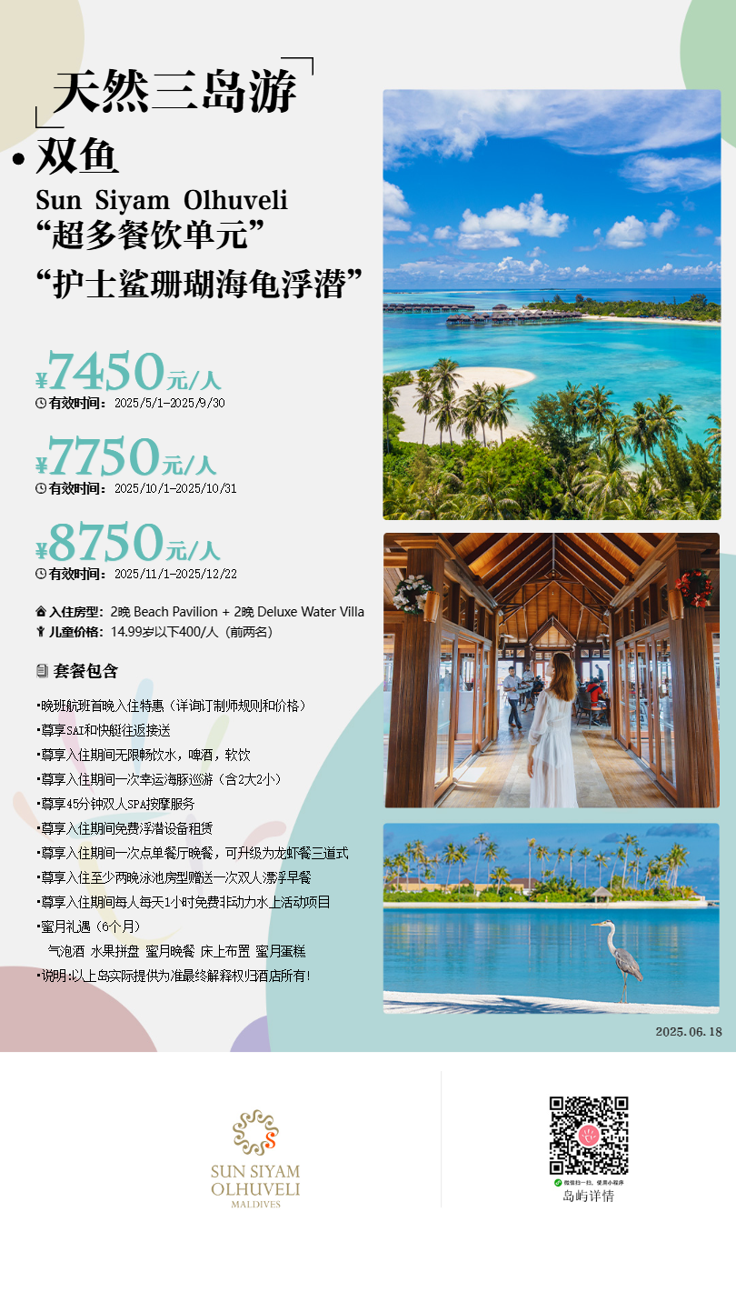 房型介绍:沙滩阳台房分为 40间日出房型 和 60间日落房型 其中有50间双床房,装修偏法式南洋风,自然舒适,为度假时光注入慵懒放松的气息,在2024年12月进行了全新升级。门通向宽敞的海滨露台或全景阳台,几步之遥即可到达泻湖的温暖海水。出门步行60秒,即可体验马尔代夫海景泳池(210米)是目前马尔代夫最长的泳道。内部设有宽敞的特大号卧室,通向带步入式淋浴间和更衣区的浴室。属于一栋4户的沙滩房型。楼上视野开阔,楼下直接可以漫步沙滩。非常适合朋友相约出行,或者一大家子出行,既保证了隐私,又便于相互照顾。