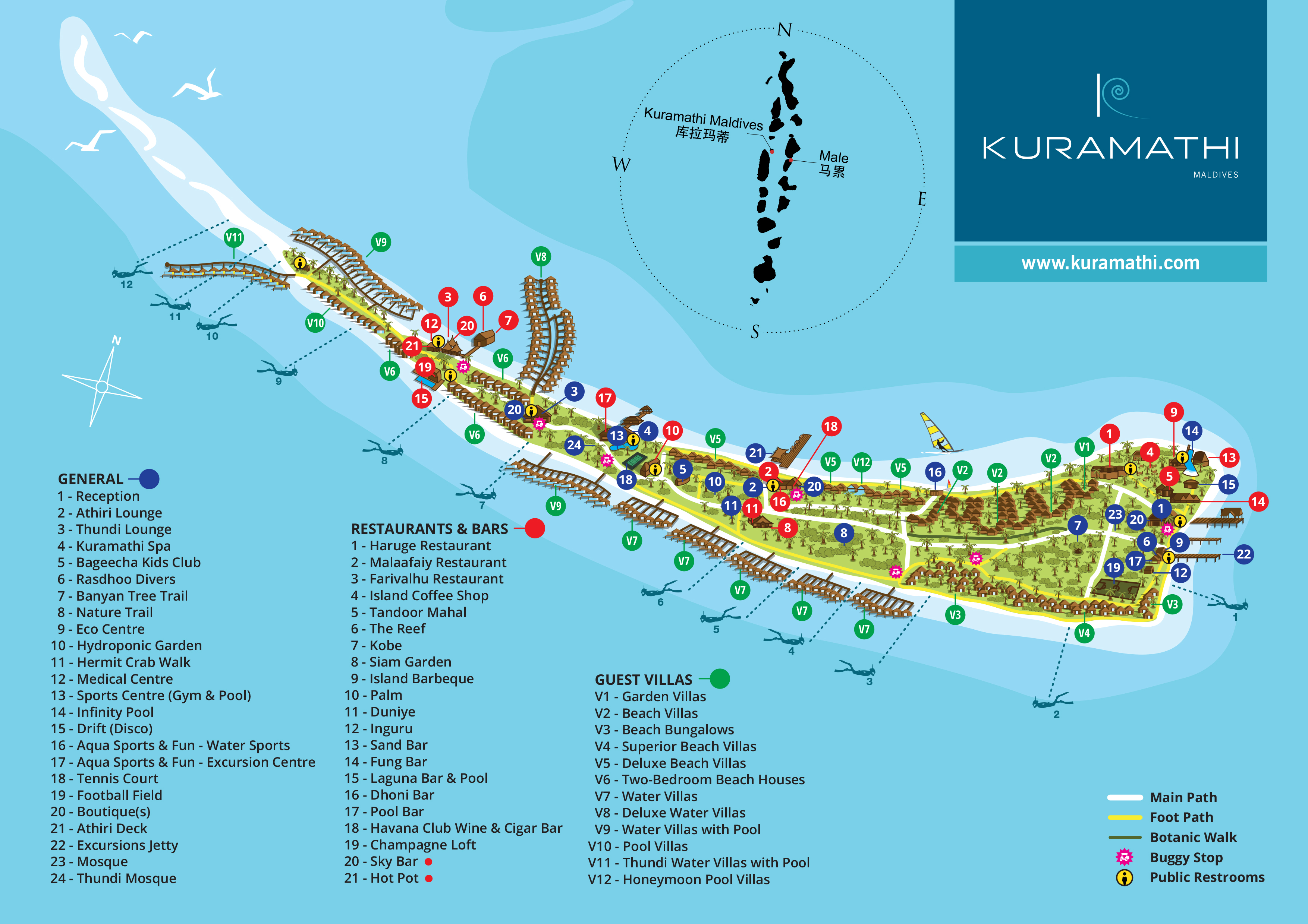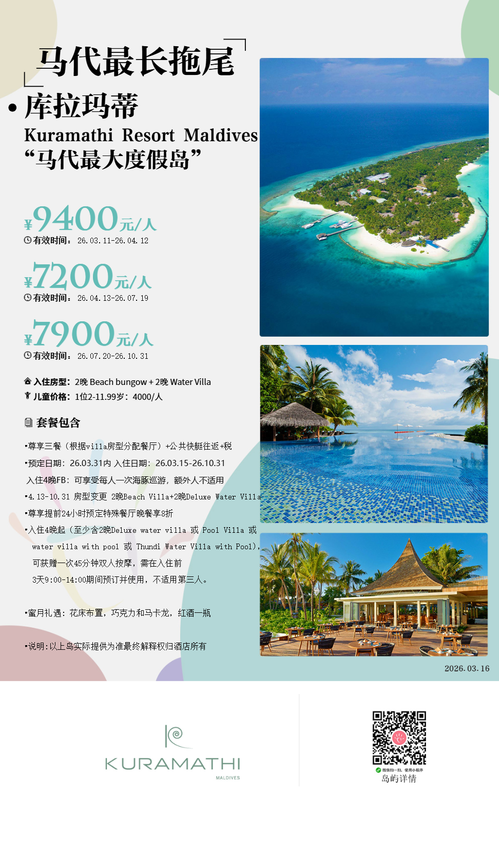 马尔代夫库拉玛蒂Kuramathi Resort Maldives,又称K岛,是一家5星级度假岛屿,一处美丽的人间天堂,马尔代夫最大的岛屿之一。在那里您会被美丽的自然景色所陶醉而乐而忘返,原来岛上有三家酒店,2009年11月重新开幕,合并成一家酒店。度假村的园区内种满了茂盛的、香气迷人的素馨花、美丽的芙蓉花和九重葛花、牵牛花,您可以在这里侍弄这些花草,实现您做一个园丁的梦。在度假村前海滩上印度洋那层叠的海浪里冲浪戏水是您度过假期最好的方式。库拉玛提岛也叫大托尾岛,顾名思义这个岛的尾部有一条很长的沙滩,像尾巴一样拖着,英文名sandbank。在马尔代夫带有这样的岛有很多,那么大拖尾的,马尔代夫只此一家,非常难得。