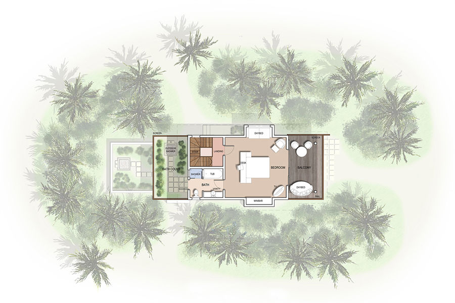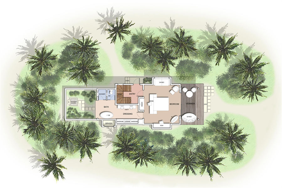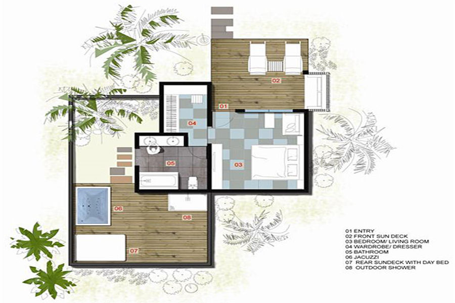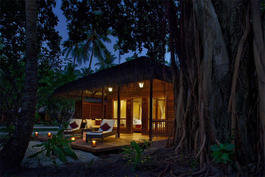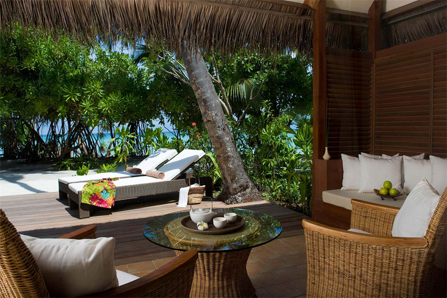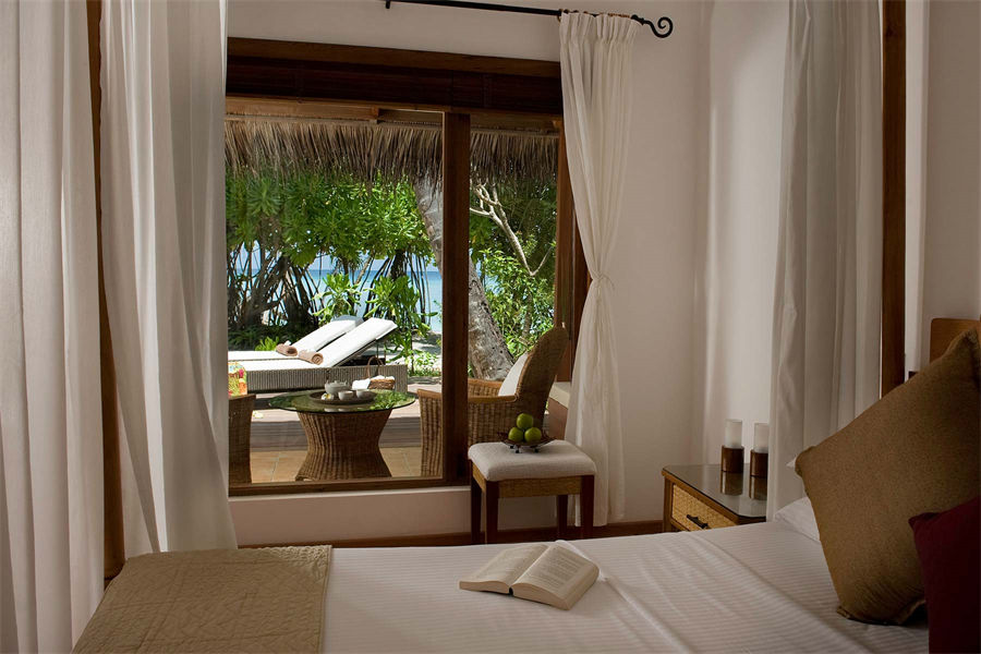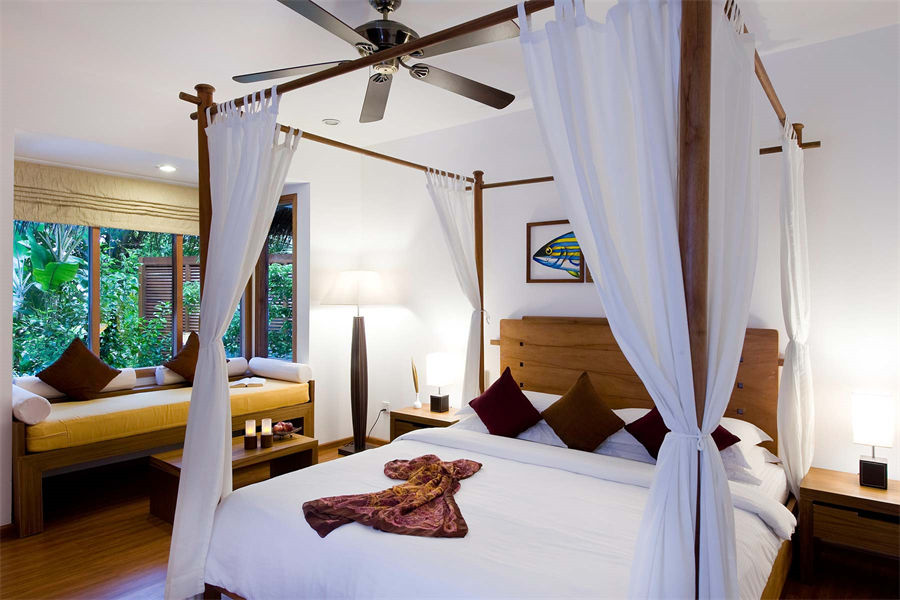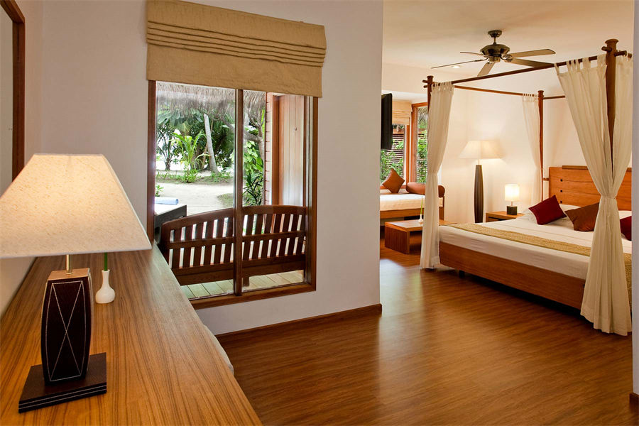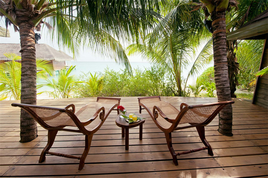 房型介绍:沙滩别墅是隐藏在茂盛的植物中的独立别墅,距离海滩只有几步之遥。这些别墅面对岛上的泻湖侧,设有特大四柱床,宽敞的木质甲板的前部有沙发床和躺椅。海滩别墅还包括半露天的浴室,设有户外花洒淋浴。