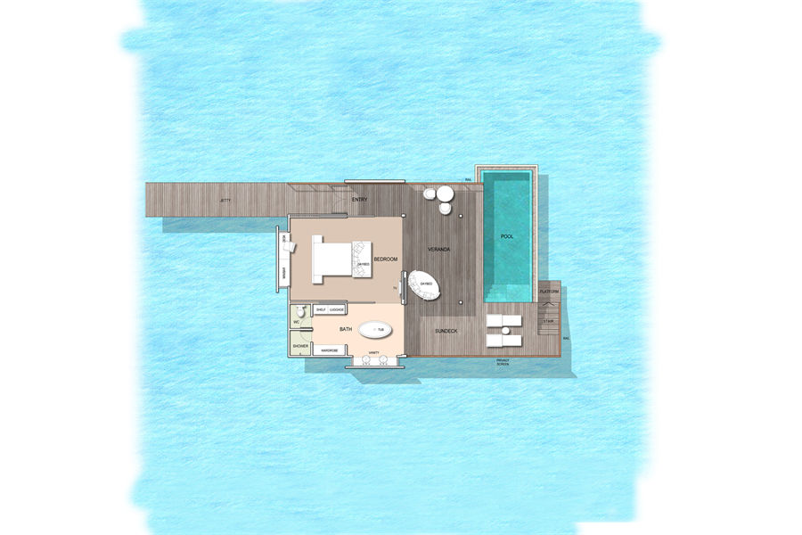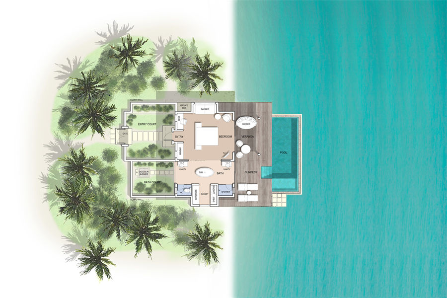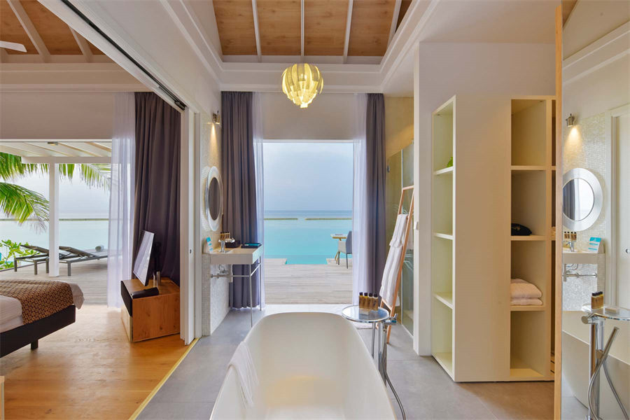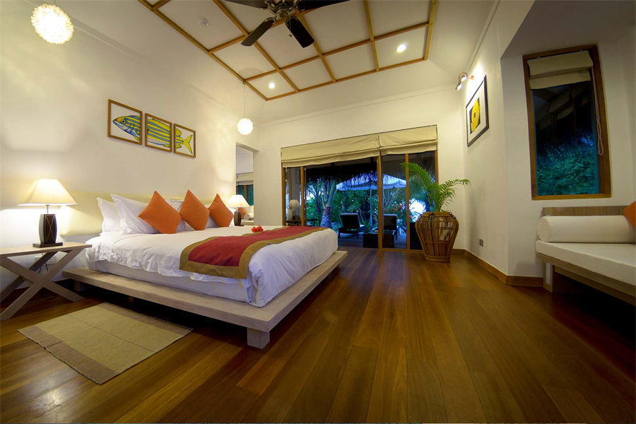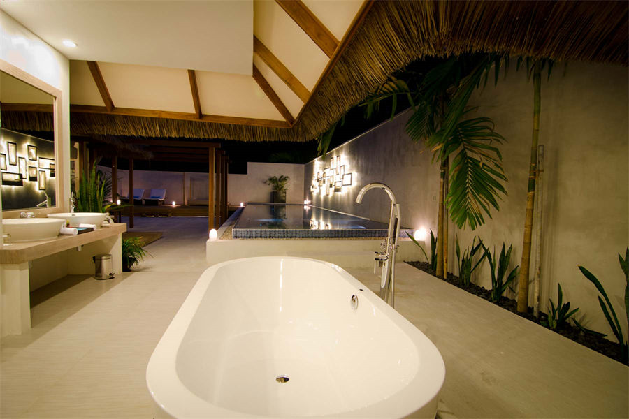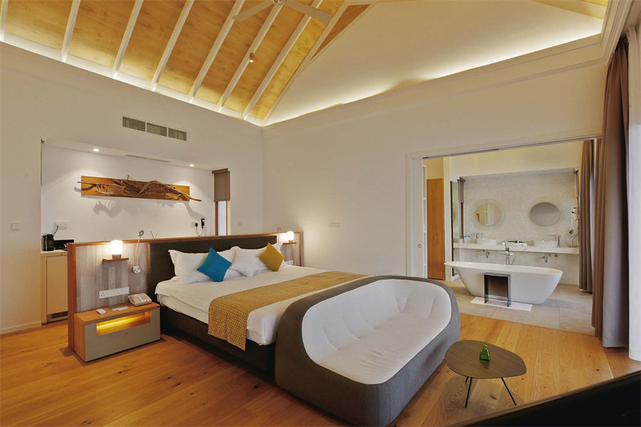 房型介绍:桑迪别墅在风格和大小上都与水上泳池别墅相同。但由于它们位于很受欢迎的库拉玛蒂沙岸的边缘,因此体验感也更好。配有步入式衣橱和一个室内浴室,一个独立浴缸,和一个单独的室外雨水淋浴。