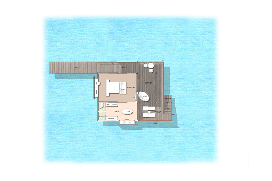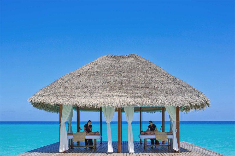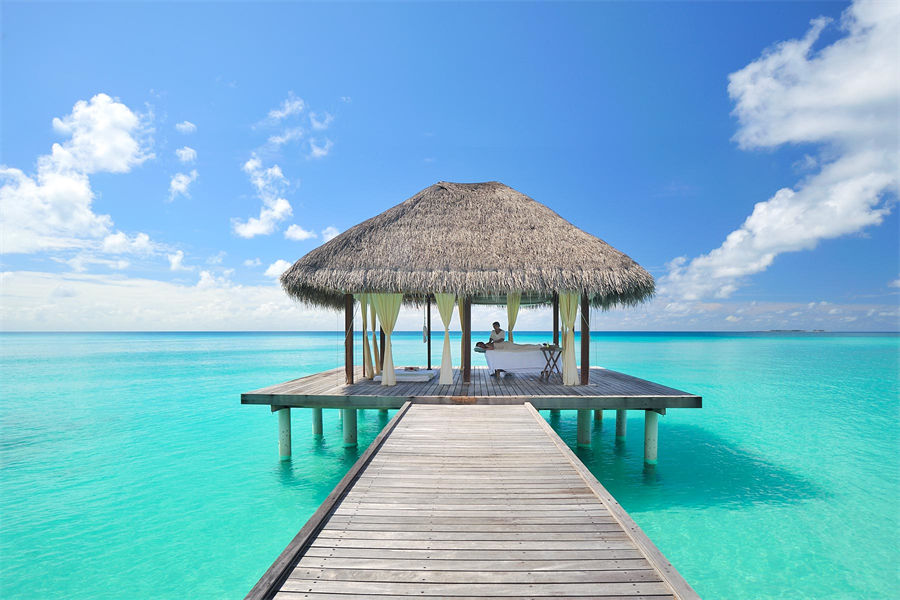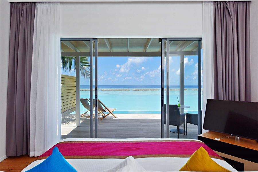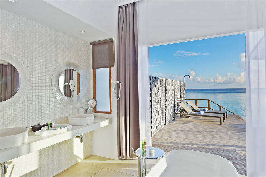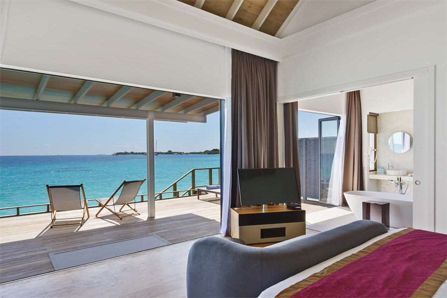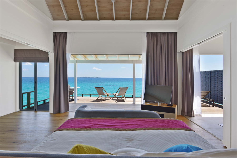 房型介绍:水上别墅设有通风的卧室特大号床和一个宽敞的浴室,双面盆和淋浴,水下有丰富多彩的海洋生物和无数暗礁。别墅还包括一个按摩浴缸,日光浴椅和太阳伞的超大的日光浴场。欣赏印度洋海景并享受一杯饮料,播放最喜爱的音乐,实在是人生一大乐事。