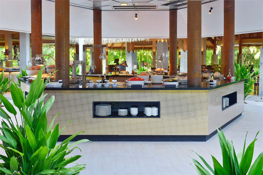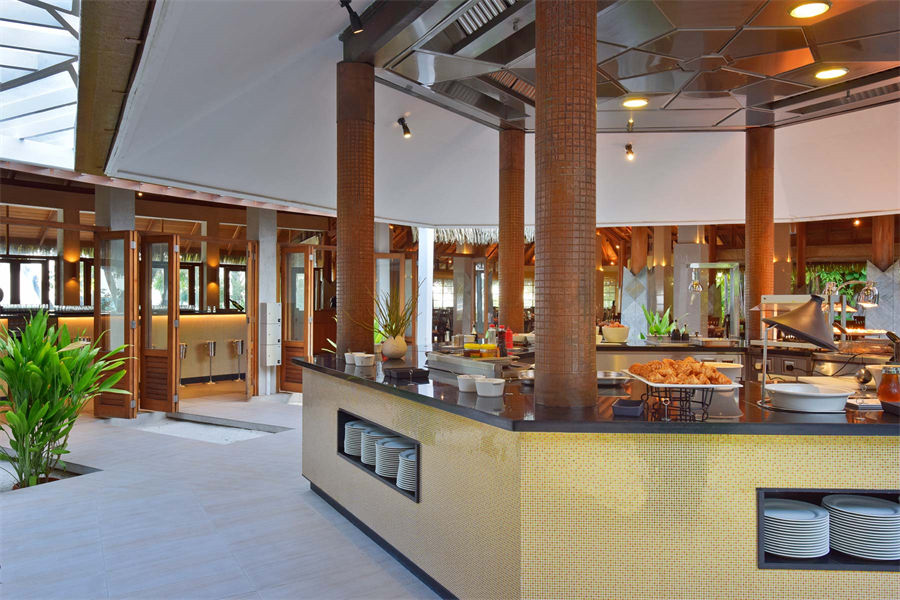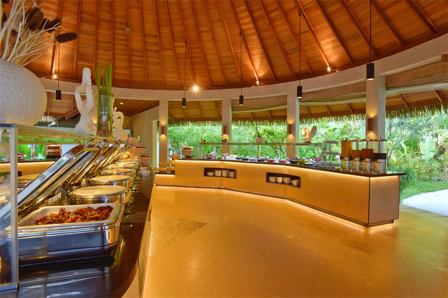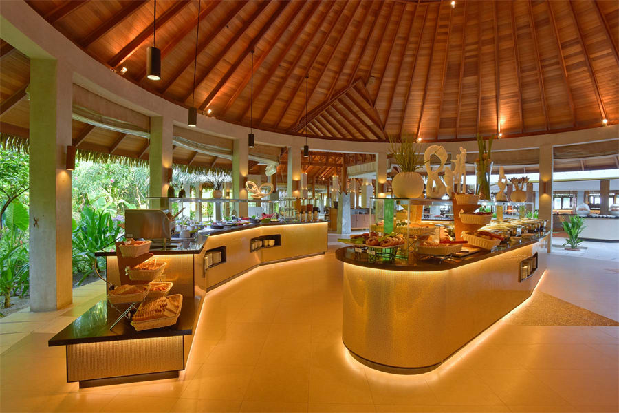 餐厅介绍:度假村的主餐厅一共有3家,分别位于岛上的不同位置,都供应早中晚三餐,早餐的提供的食物非常广泛,不但有新鲜的面包,水果,果汁还有煎蛋和华夫饼等,中餐有各式沙拉和三明治,晚餐的自助餐则依据世界各地的主题而定。