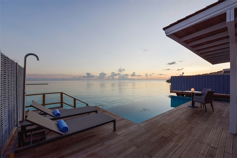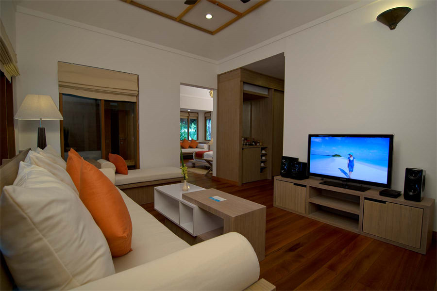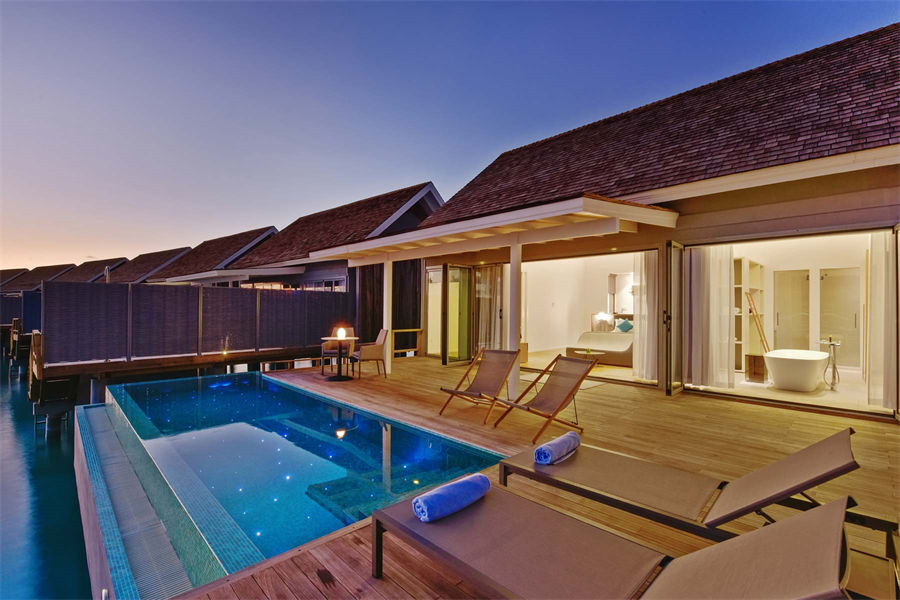 房型介绍:豪华水上别墅总面积185㎡,有110㎡的室内空间。拥有观看日落的最佳位置,采用马尔代夫传统的设计风格,并且搭配浅色系的色彩修饰,配有一个大床,卧室都配有液晶电视和一些最新的豪华设施。