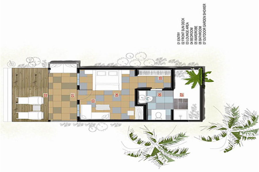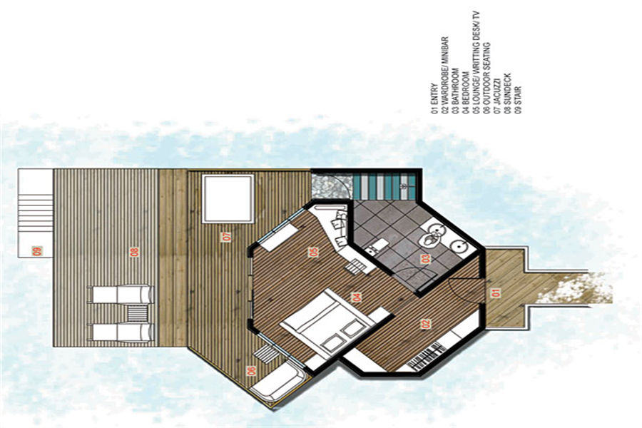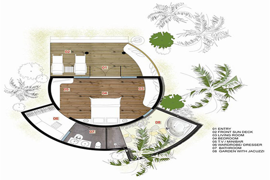 房型介绍:高级沙滩别墅采用当代设计,呈圆形,包括一个木甲板,一个诱人的内置在室外的长椅和日光浴椅。卧室是宽敞简约的,还有特大号床。别墅还有露天浴室,户外按摩浴缸。