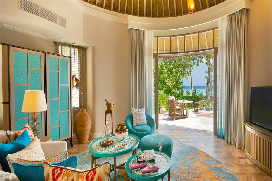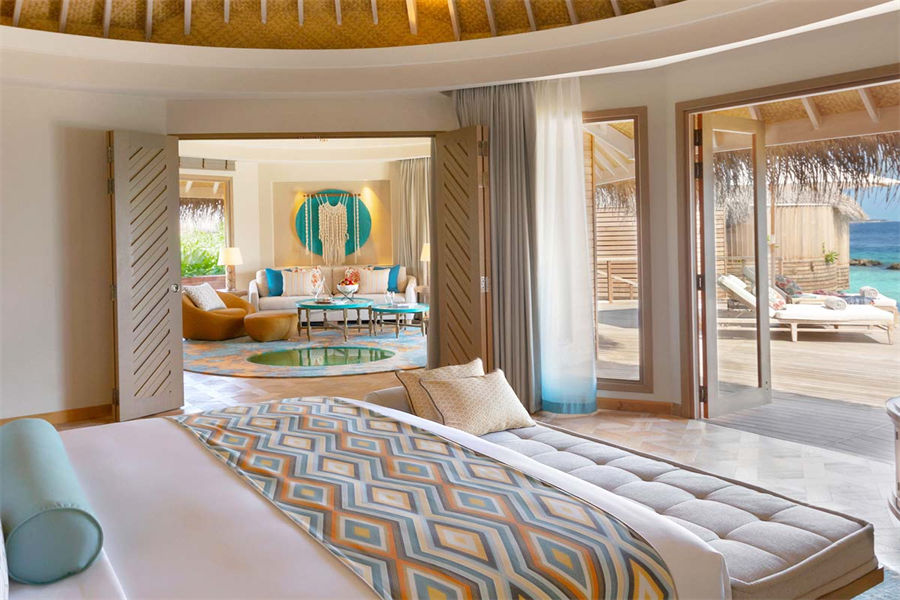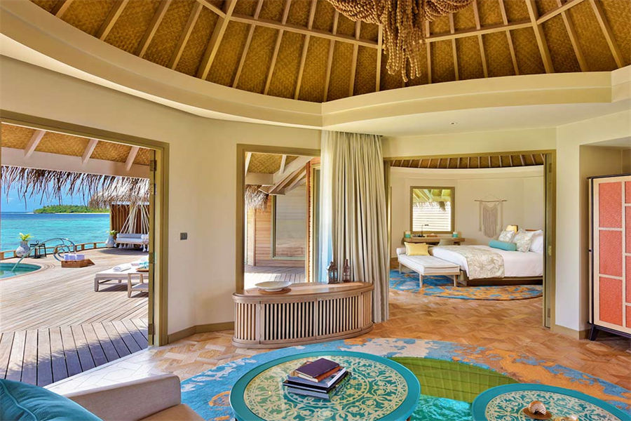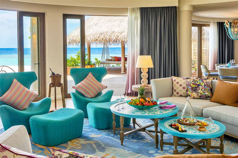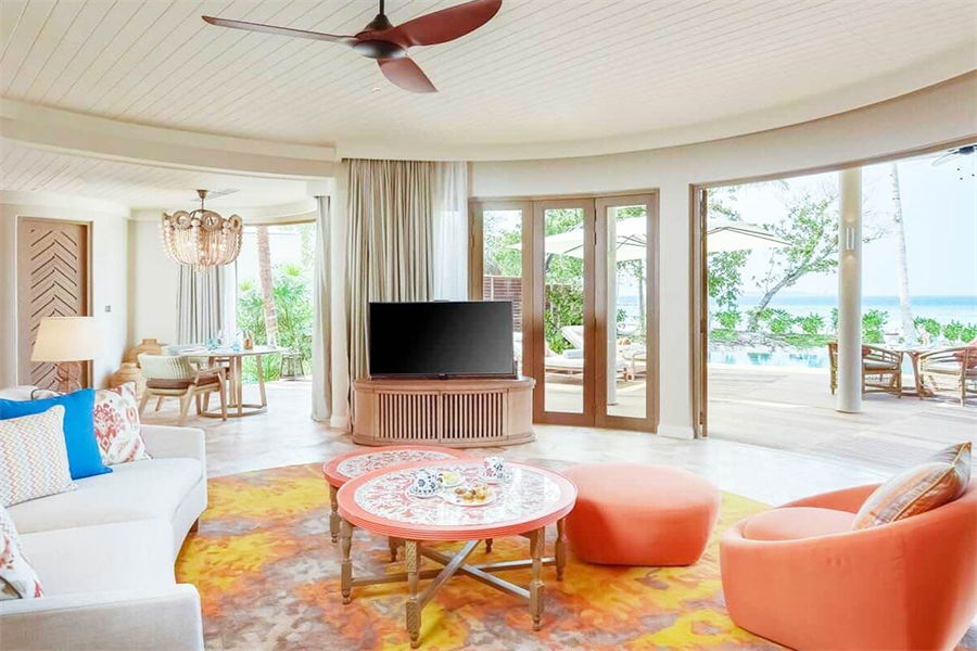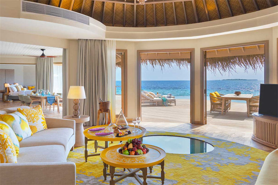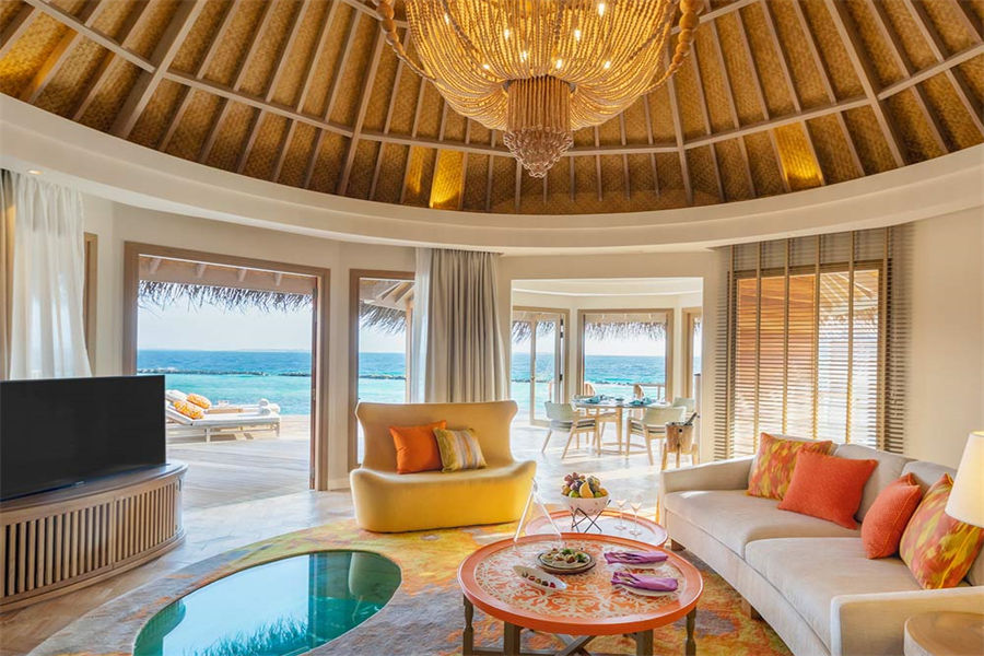 房型介绍:波斯米亚的幸福感在这里会找到答案。入门就是迷幻的玻璃地板,精致宽敞的客厅和独立的卧室,每一处都是静心布置的,温馨舒适的氛围下,让您有家的感觉。专门的用餐区域,毗邻化妆间和吧台,透过落地玻璃,让阳台甲板和无边泳池似乎都是一体的。从泳池边上小楼梯直达大海畅泳的感觉,这或许就是马尔代夫的豪华专属了。