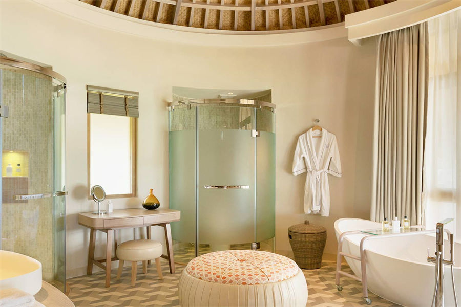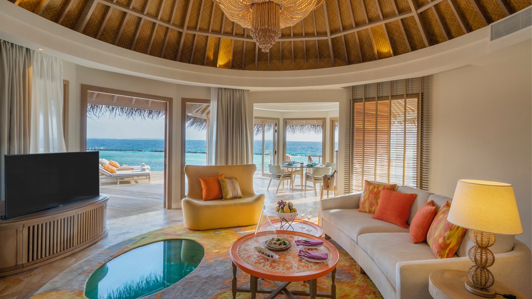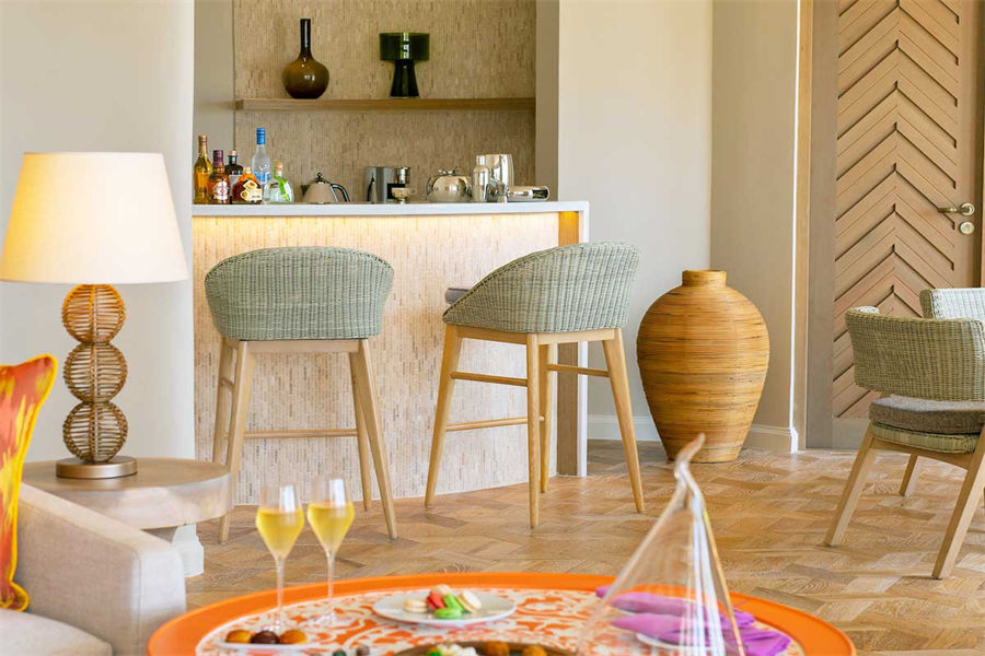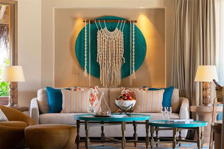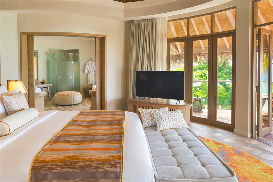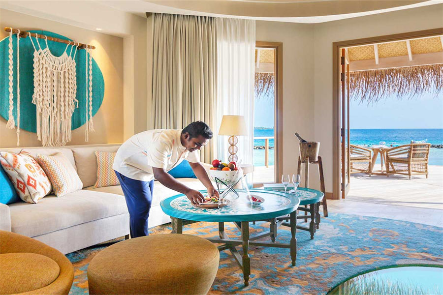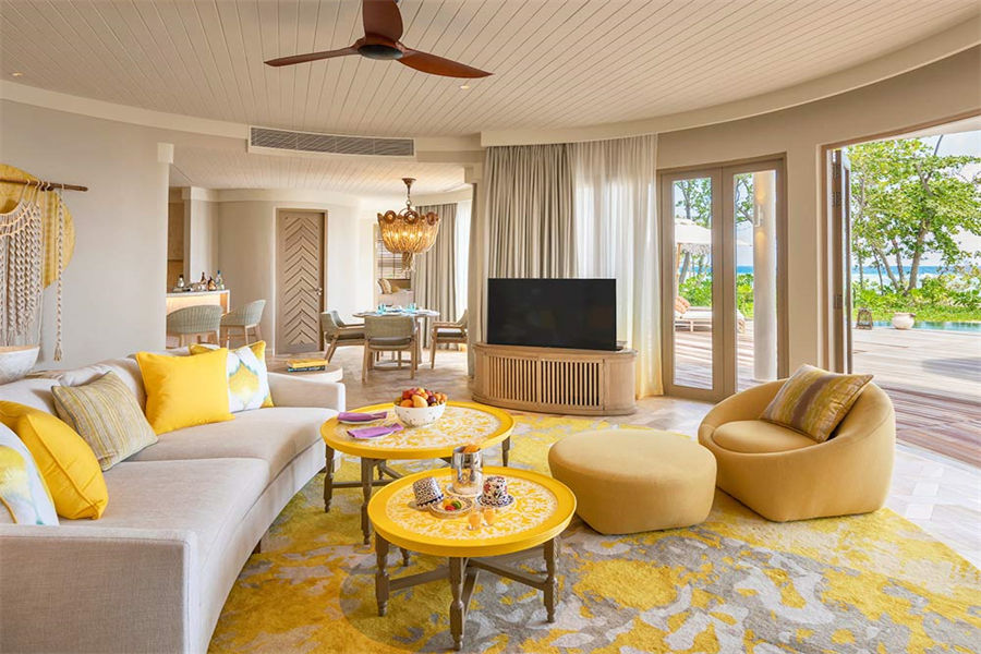 房型介绍:波斯米亚的幸福感在这里会找到答案。入门就是迷幻的玻璃地板,精致宽敞的客厅和独立的卧室,每一处都是静心布置的,温馨舒适的氛围下,让您有家的感觉。专门的用餐区域,毗邻化妆间和吧台,透过落地玻璃,让阳台甲板和无边泳池似乎都是一体的。从泳池边上小楼梯直达大海畅泳的感觉,这或许就是马尔代夫的豪华专属了。
