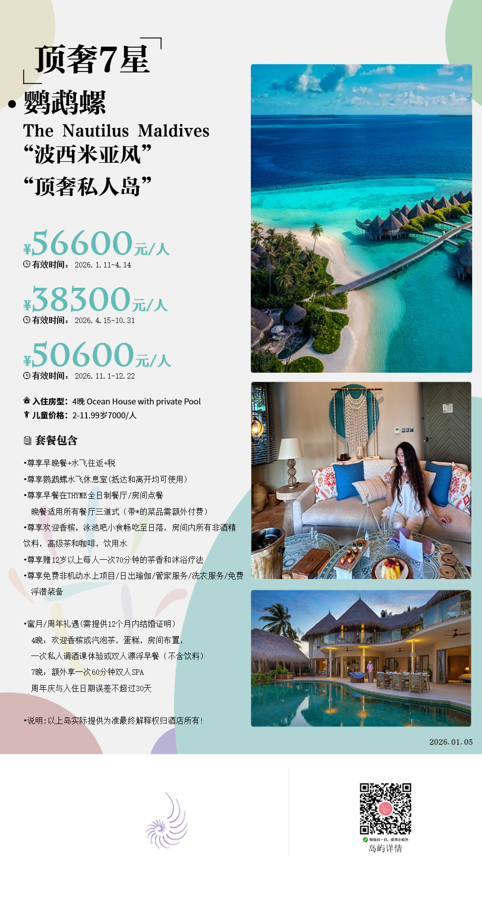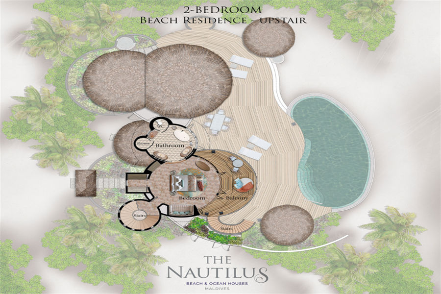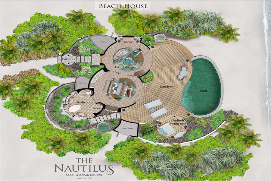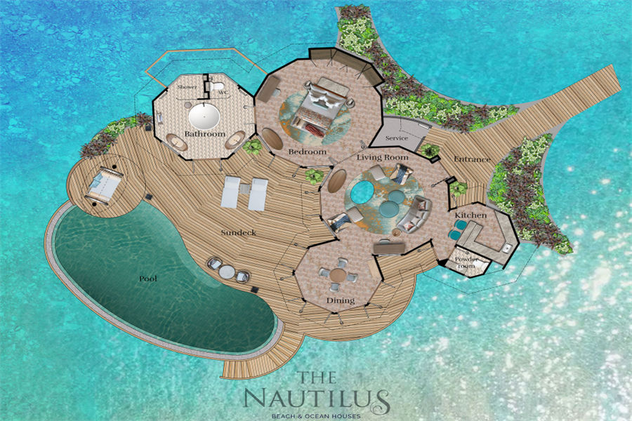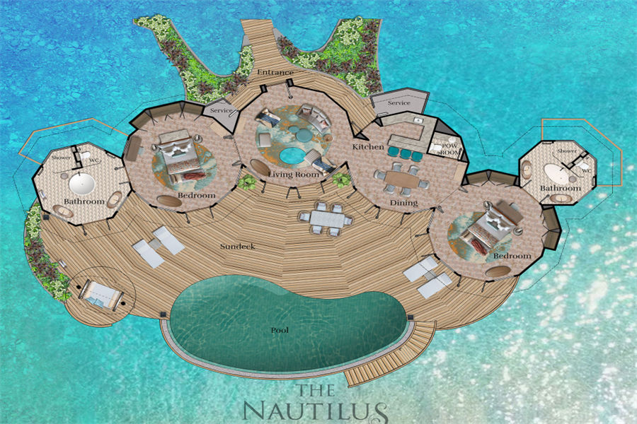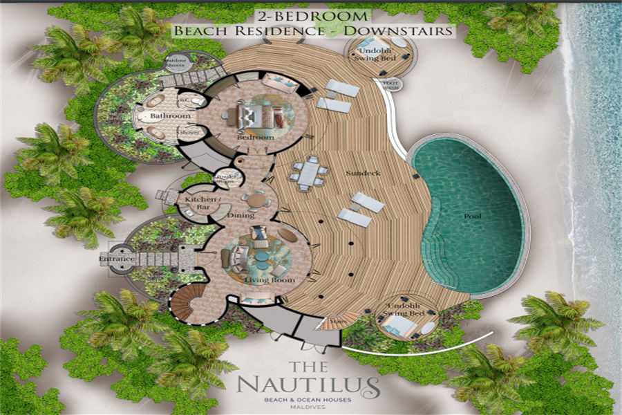 房型介绍:鹦鹉螺私人岛特别为家庭出行的您精心打造双卧海滩府邸。不管在哪个卧室,360°无敌海景,尽收眼底。楼下次卧,化妆间,饭厅,水吧一应俱全。楼上主卧,视野开阔。私人阳台甲板和蔚蓝的泳池直接延伸到粉状细沙处,天然接壤,人和自然的完美配合。