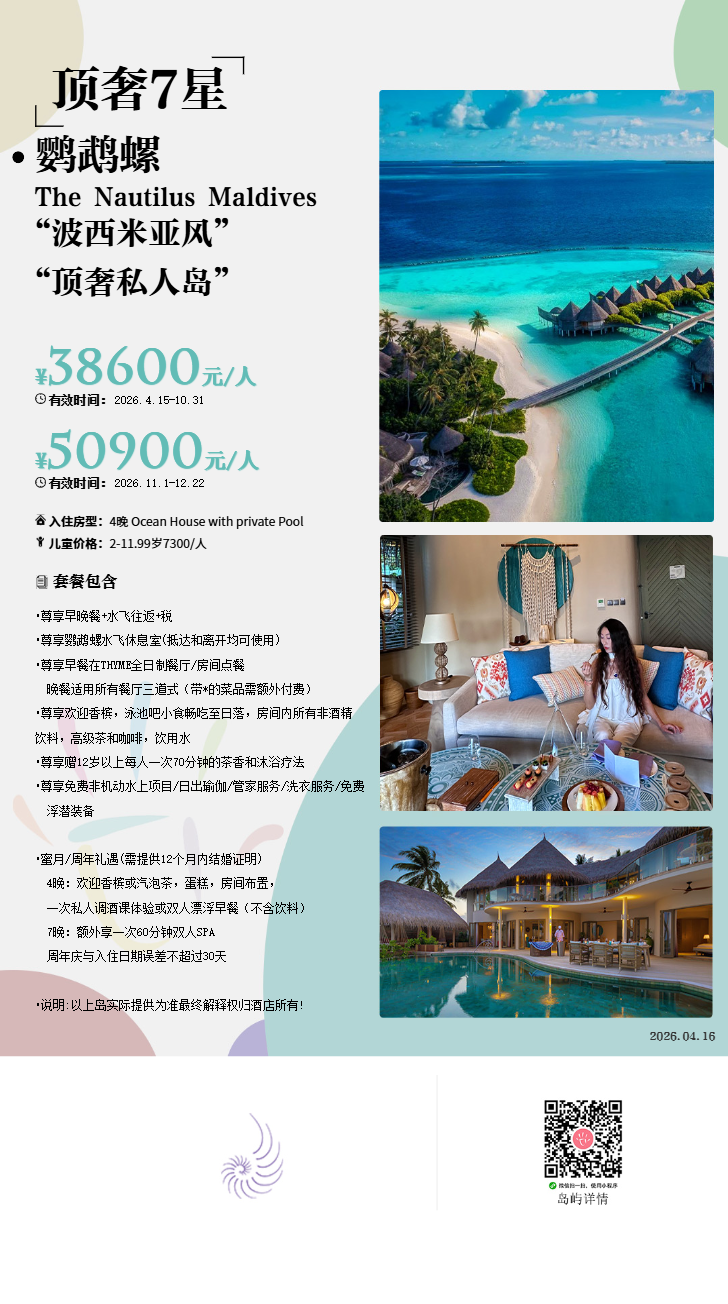 活动介绍:鹦鹉螺专属的水飞休息室,给您美好的旅行始末。