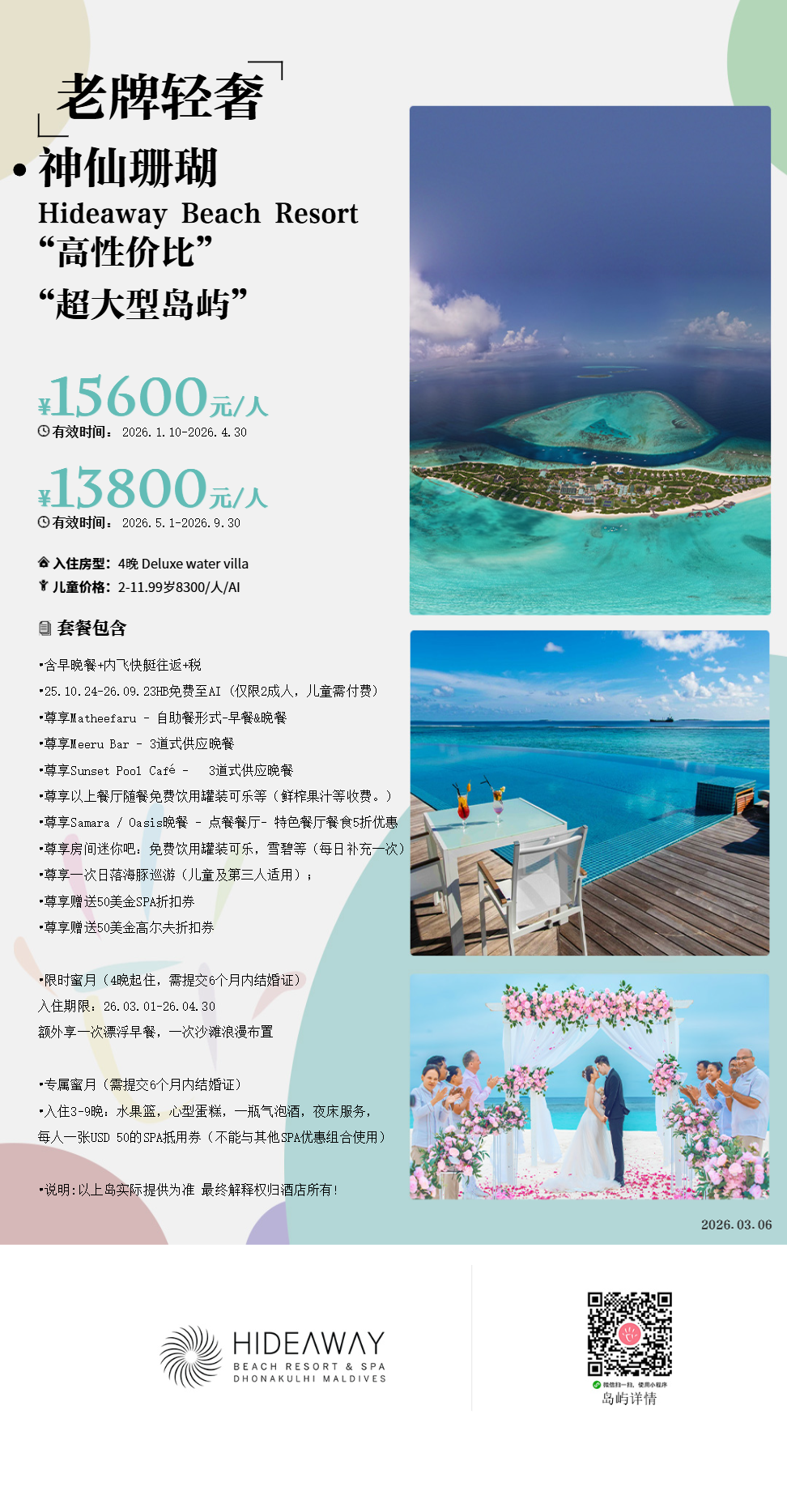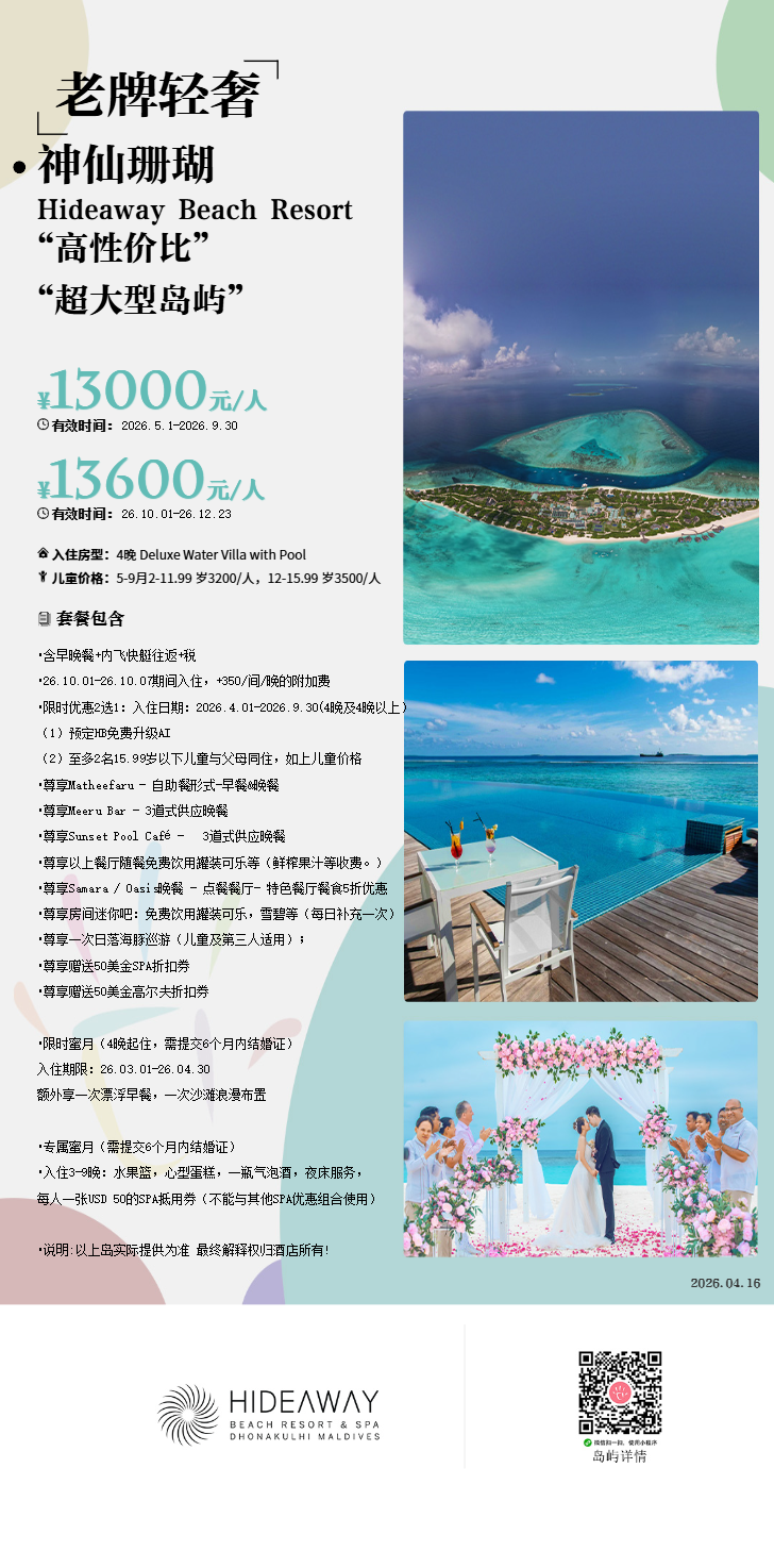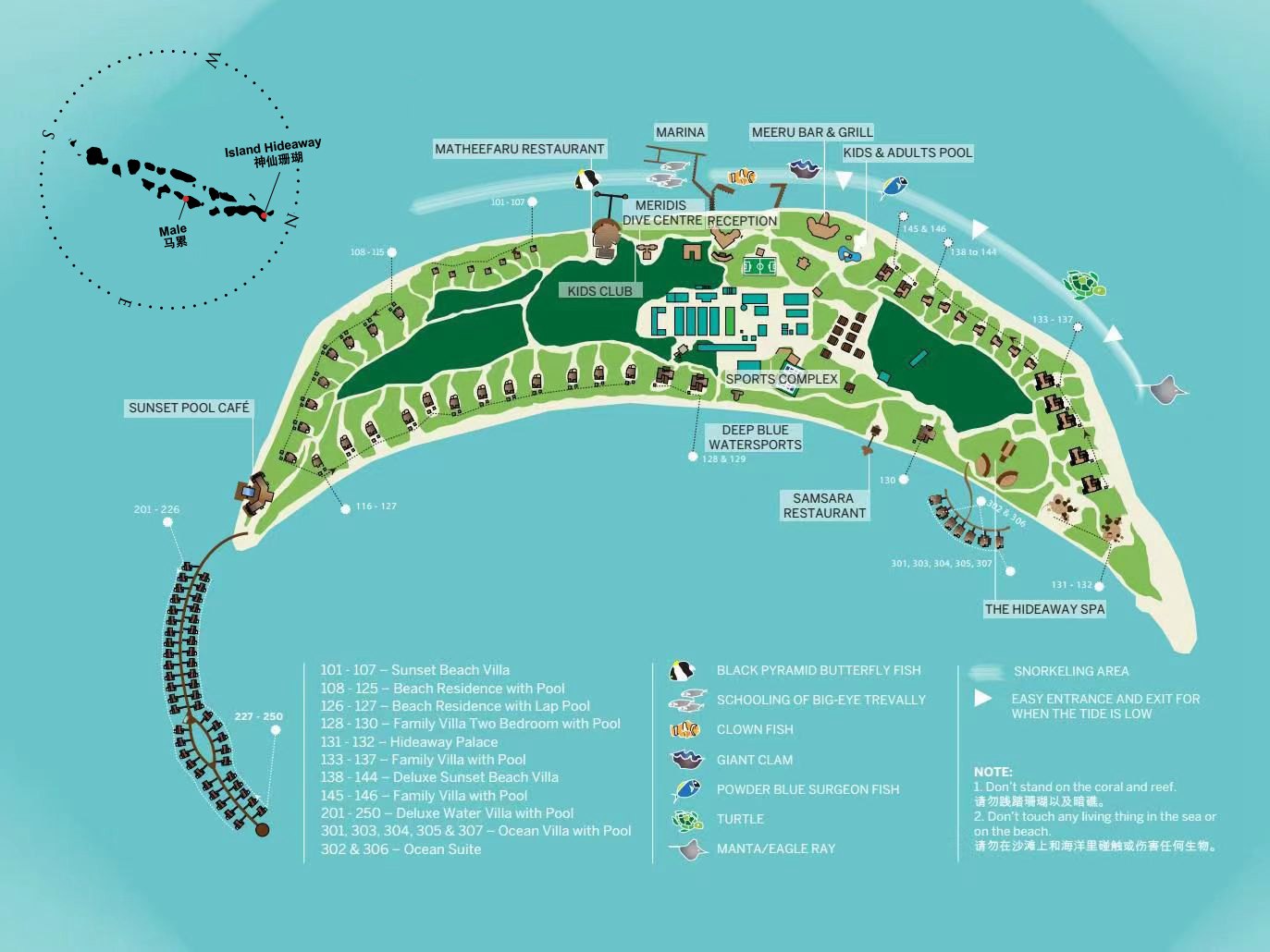 马尔代夫神仙珊瑚Hideaway Beach Resort &Spa,是马尔代夫完美的岛屿度假胜地,位于哈阿里夫环礁北部。 一个独家的全套房度假村,为那些真正需要豪华和隐私最佳的度假胜地。 这个非凡的度假胜地坐落在一个新月形的私人岛屿上,提供私人别墅或泳池别墅,可供客人放松身心,享受“家外之家“的私人别墅。 海滨或水上别墅和相关的隐私级别是这个获奖目的地的标志,拥有马尔代夫最大的海滨别墅。 美食爱好者可以享受屡获殊荣的美食体验。 幸福是Hideaway的核心体验,非凡的Hideaway Spa提供一系列的复兴和放松治疗。 度假村周围的鱼类丰富,是首屈一指的潜水,是浮潜和水肺潜水的理想地点。 非凡的马尔代夫度假村,Hideaway提供极致的浪漫,是庆祝蜜月的首选目的地之一。 Hideaway酒店欢迎家庭入住,并设有一个广大的儿童俱乐部,帮助小旅客们在入住期间享受娱乐活动。整个岛屿很大,绕岛一周大概需要50分钟,在码头靠近海沟一侧地方,有很多鱼群和珊瑚,有小型沙滩拖尾。