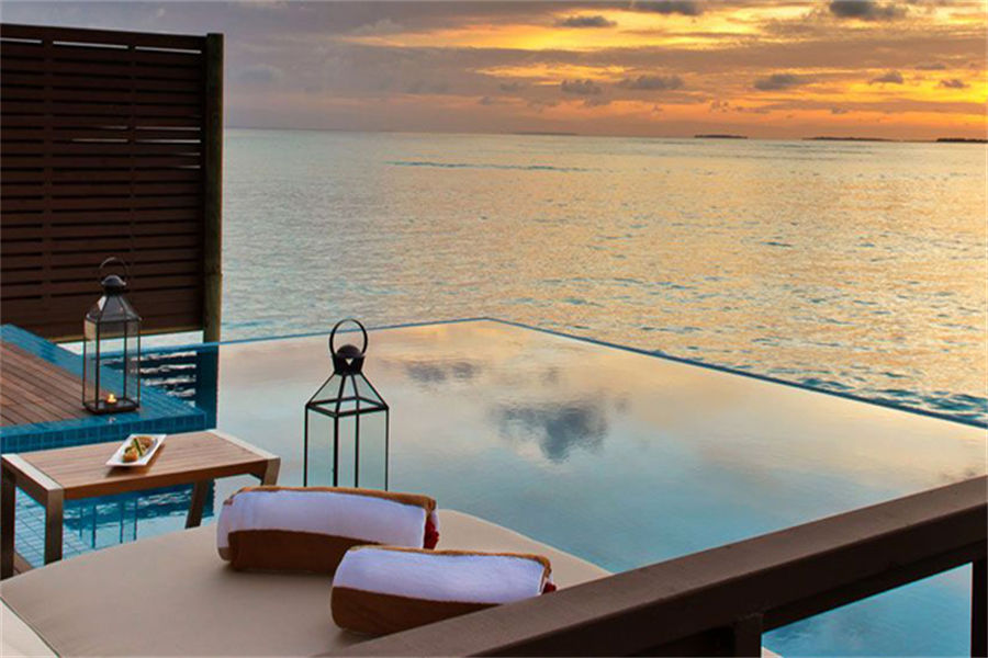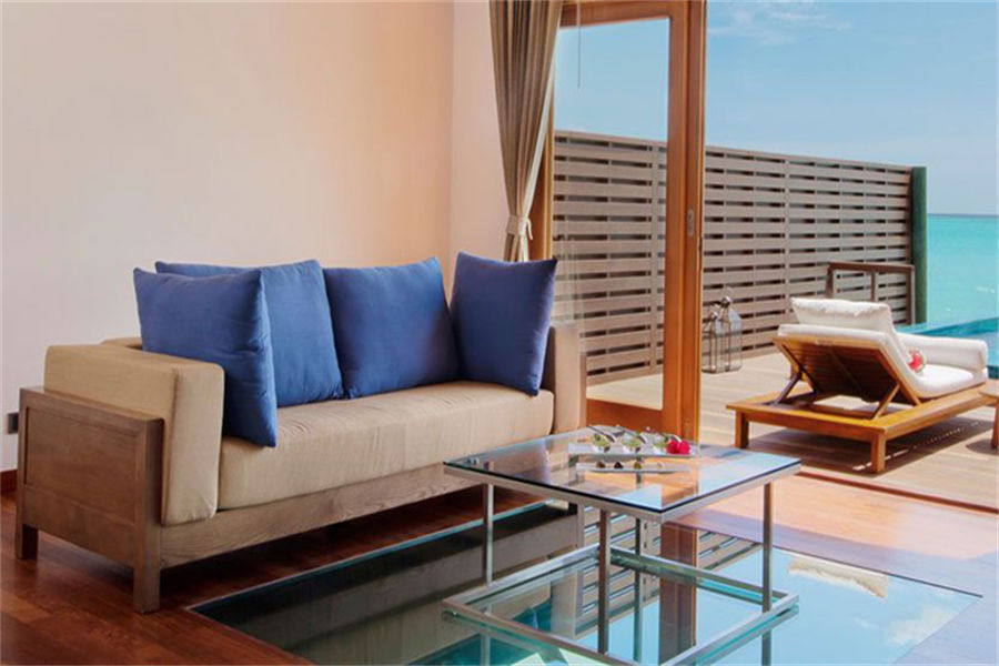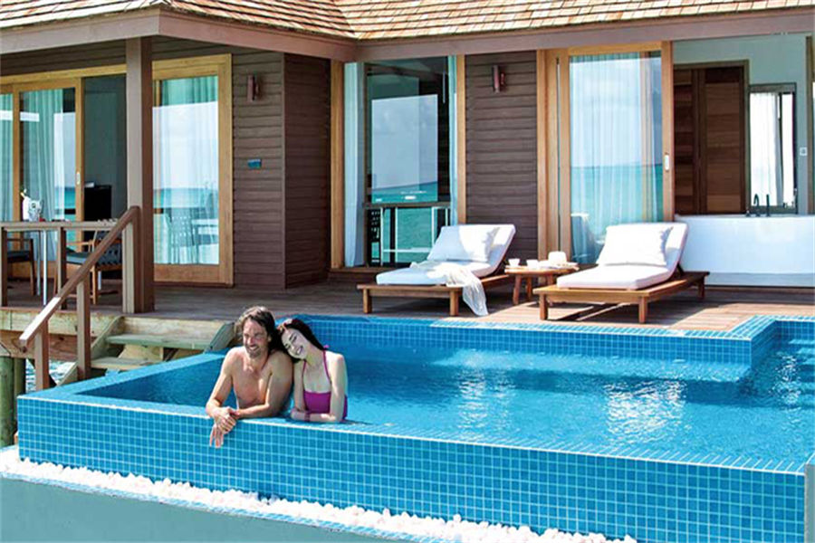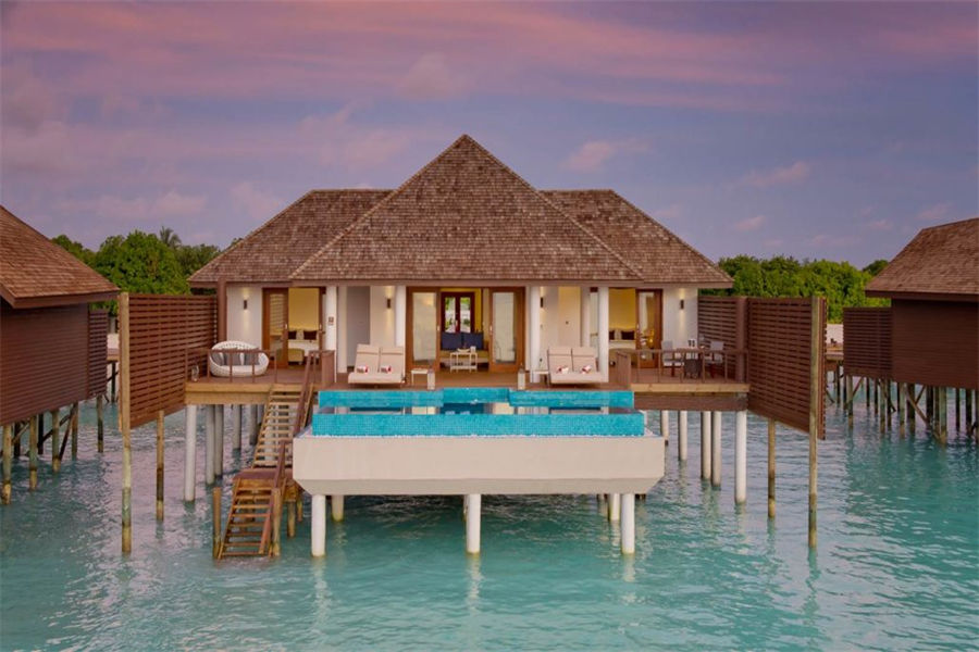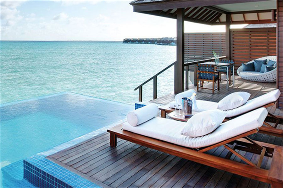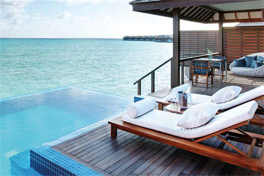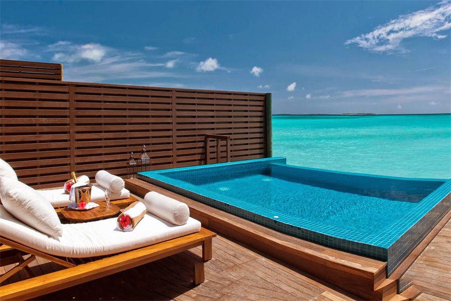房型介绍:全岛50栋的豪华水上泳池别墅面积为190㎡,高级水上别墅耸立在碧蓝色环礁湖水中的木制脚柱上,可以在别墅用餐区的日光台上欣赏无尽的蓝色地平线,打发懒散的假日时光,或是直接跃入湖中畅游一番。