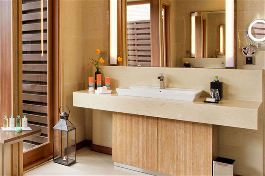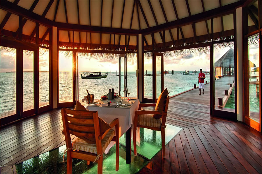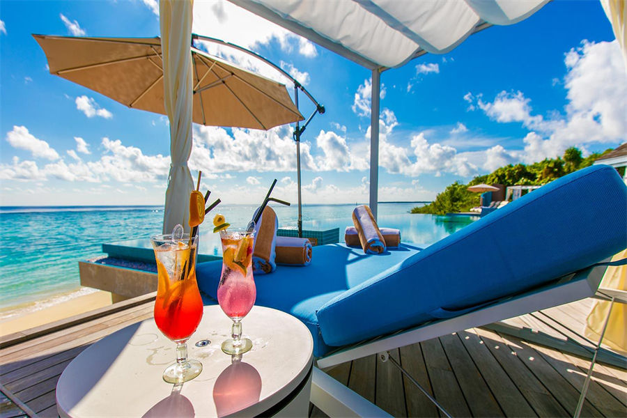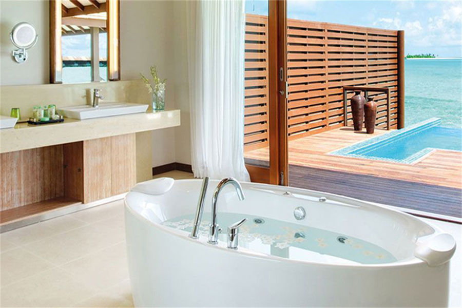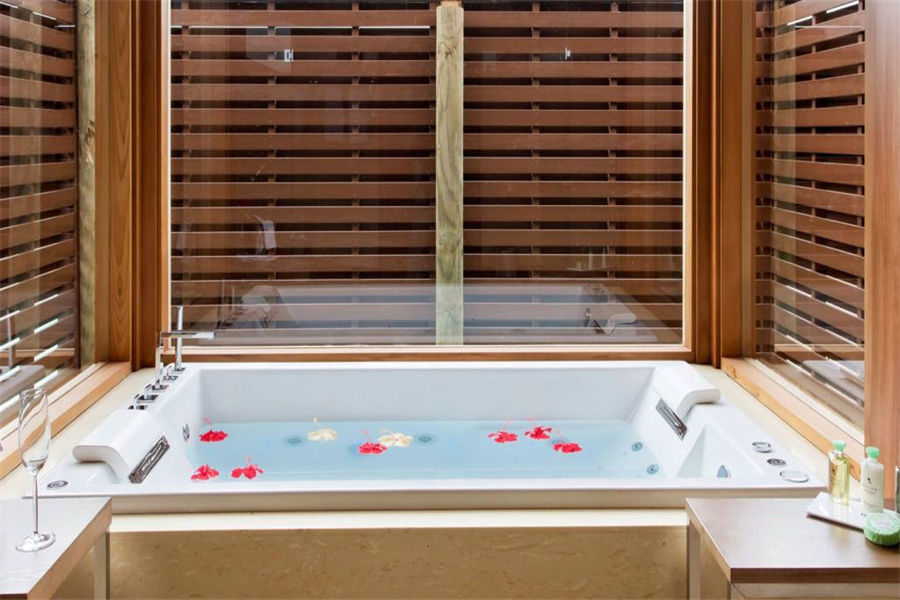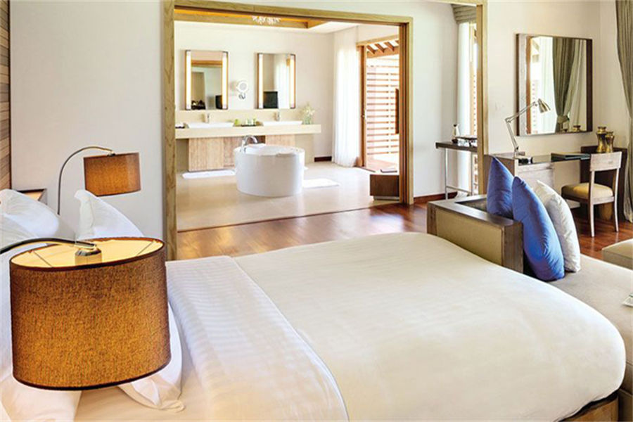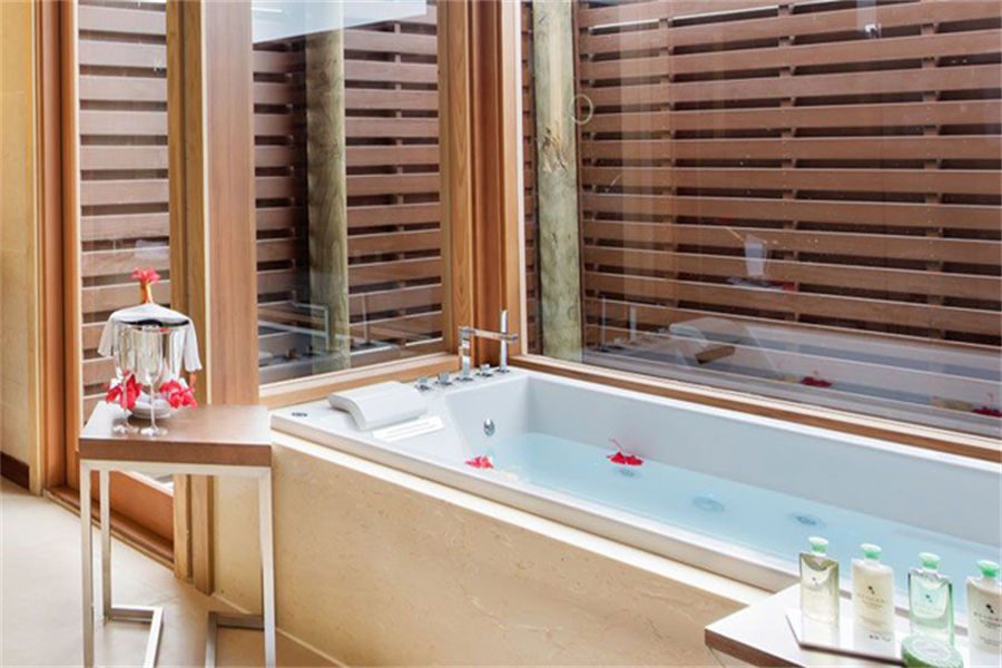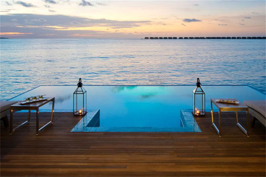 房型介绍:全岛50栋的豪华水上泳池别墅面积为190㎡,高级水上别墅耸立在碧蓝色环礁湖水中的木制脚柱上,可以在别墅用餐区的日光台上欣赏无尽的蓝色地平线,打发懒散的假日时光,或是直接跃入湖中畅游一番。
