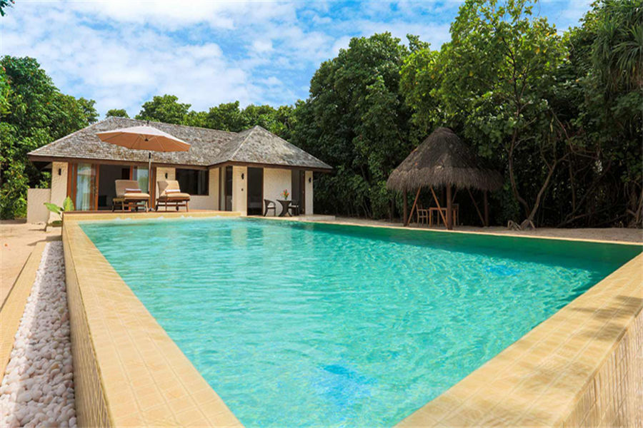 房型介绍:全岛7栋的家庭泳池别墅面积为440㎡。,建立在干净的沙滩上。每一栋别墅中都配备一个专属的无边际游泳池,一个可俯瞰游泳池和海滩的露天平台,户外座椅区和茂密的私人花园。经过一处马尔代夫风格的中庭进入家庭别墅,别墅通向一个宽敞的起居室,可以俯瞰大洋。