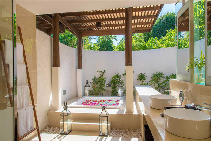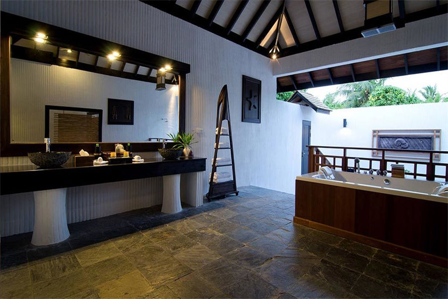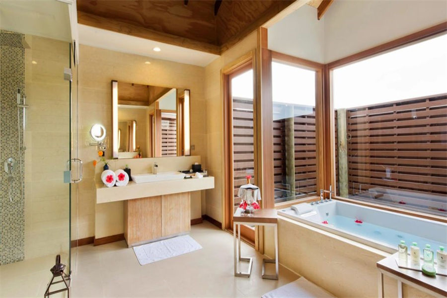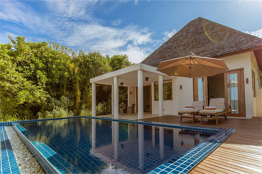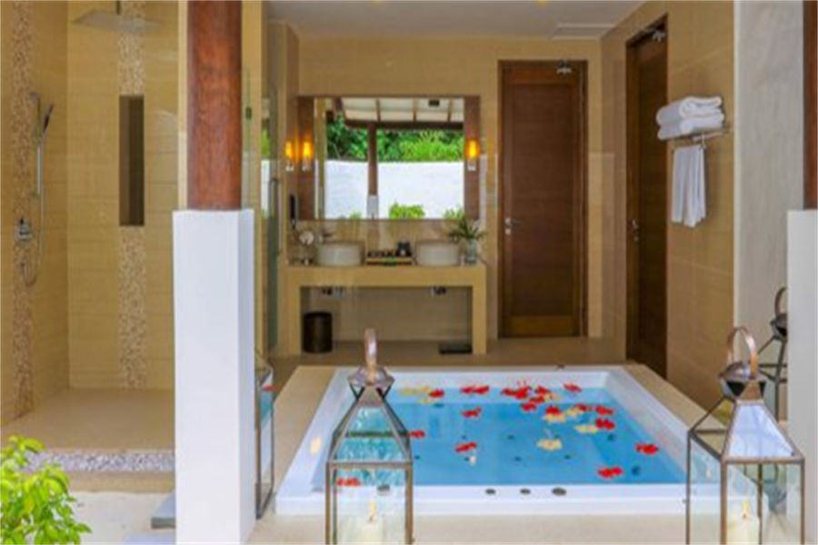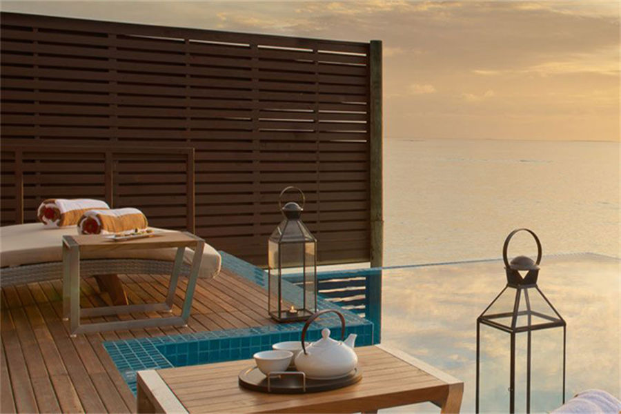 房型介绍:全岛5栋的海洋泳池别墅面积为290㎡,俯瞰印度洋,带有餐厅和起居室,户外甲板区,带电视的室内浴室,走入式衣橱,独立式冲浪浴缸,两面分开的梳妆镜,单独淋浴间和卫生间,别墅用餐的日光台上可以远眺无尽的蓝色地平线,感受壮丽风景,最适宜寻求独一无二和静谧的人。