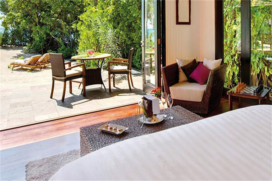 房型介绍:全岛仅1栋的格兰德海滩泳池住宅面积为700㎡,家庭和朋友团体可以体验到幸福的自由,距离印度洋清澈的海水仅几步之遥,可直接通往岛上最美丽的白色沙滩。中央起居和用餐区配有食品储藏室、化妆间和管家洗手间,为别墅增添了一丝活力,在时尚的中东风格内饰和手工制作的家具中,邀请您进行富有灵感的对话。在外面宽敞的甲板上,有室外花洒淋浴、室外健身房、桑拿浴室和一个巨大的弧形私人游泳池,可望向地平线。您的专属特色管家可轻松提升您的私人别墅体验,保证每一个奇思妙想都得到精致和周到的照顾。