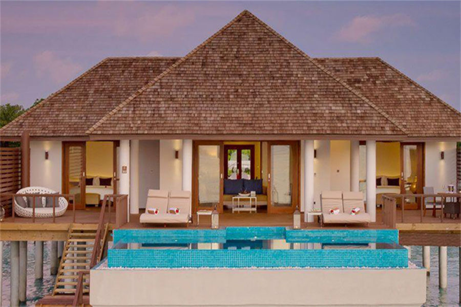 房型介绍:全岛2栋的双卧室海洋泳池别墅面积为330㎡,栖息在绿松石泻湖上方的栈道上,设有2间布置典雅的卧室,两间浴室和一个带无边泳池的宽敞阳台。个人管家将满足您的需求,并帮助您实现梦想假期。