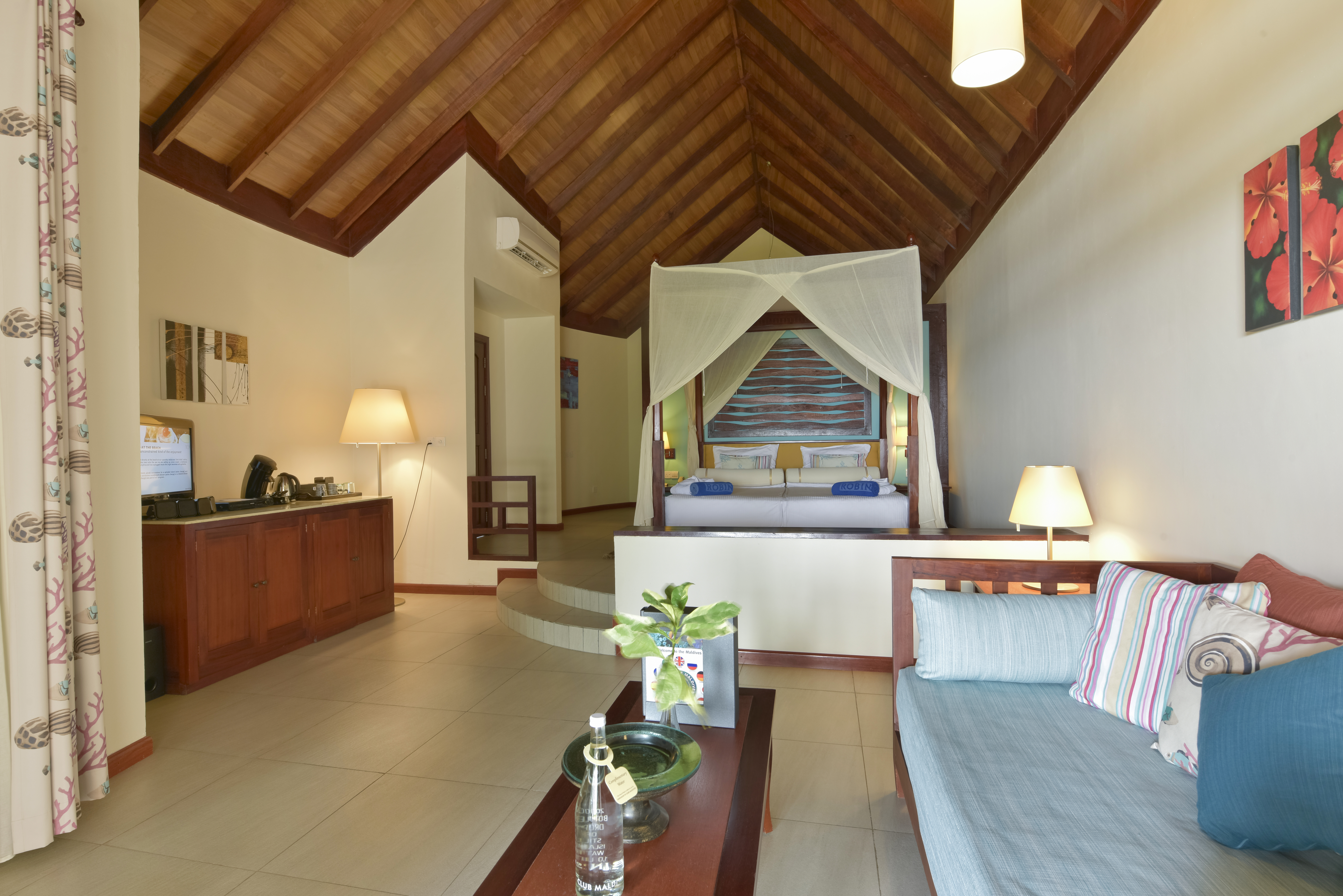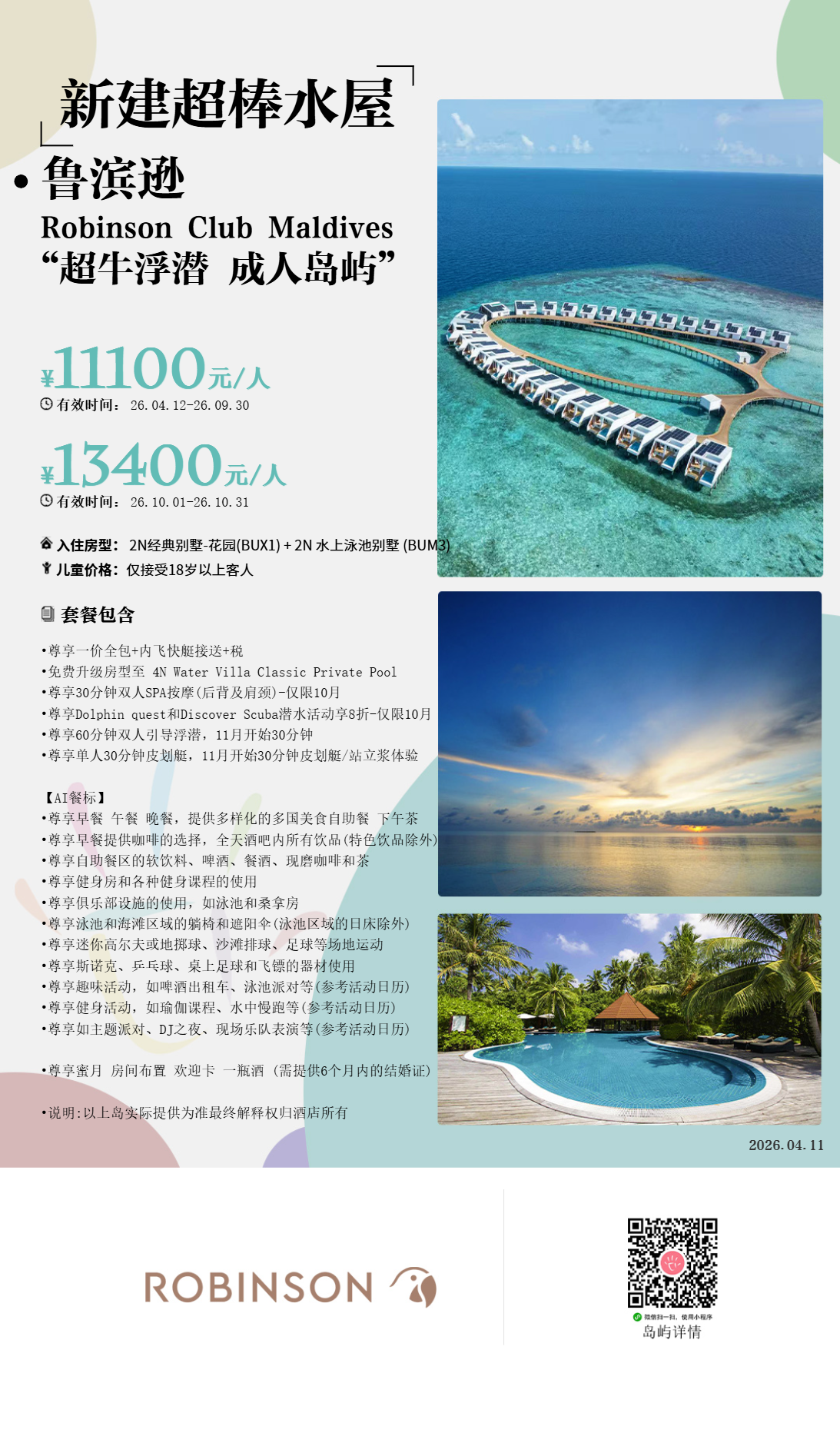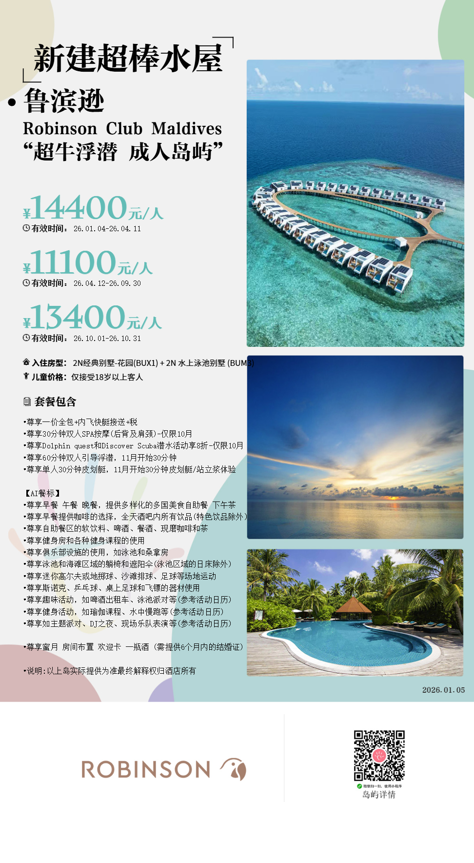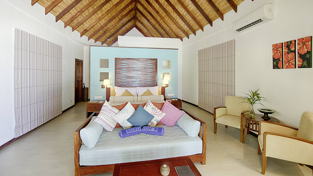 马尔代夫鲁滨逊Robinson Club Maldives,位于卡夫阿里夫环礁,距离马累国际机场约100KM。于2009年开业,很原始风的建筑,跟岛屿的环境很协调。其中有座充满水生物的屋礁,它是马尔代夫最令人赞叹的景致之一,这就是马尔代夫鲁宾逊岛。酒店2013年装修过,岛上设施豪华,丰富的一价全包体验,性价比非常突出。它的花园房四周均是植物,私密性很好,沙滩屋开门就是大海,还有浮潜点。普拉提、瑜伽、泳池有氧操和排球比赛等活动会贯穿全天。工作人员会在床头留一张"报纸",预告第二天岛上的活动安排。马尔代夫罗宾逊俱乐部藏在岛上青葱的绿丛中,矗立在卡夫阿里夫环礁湛蓝宁静的海水中。岛上水屋是马尔代夫最令人赞叹的景致之一,这就是马尔代夫罗宾逊度假村。在2025又进行了新的大装,调整了房型,增加了高级房型,扩展了基础房型面积!