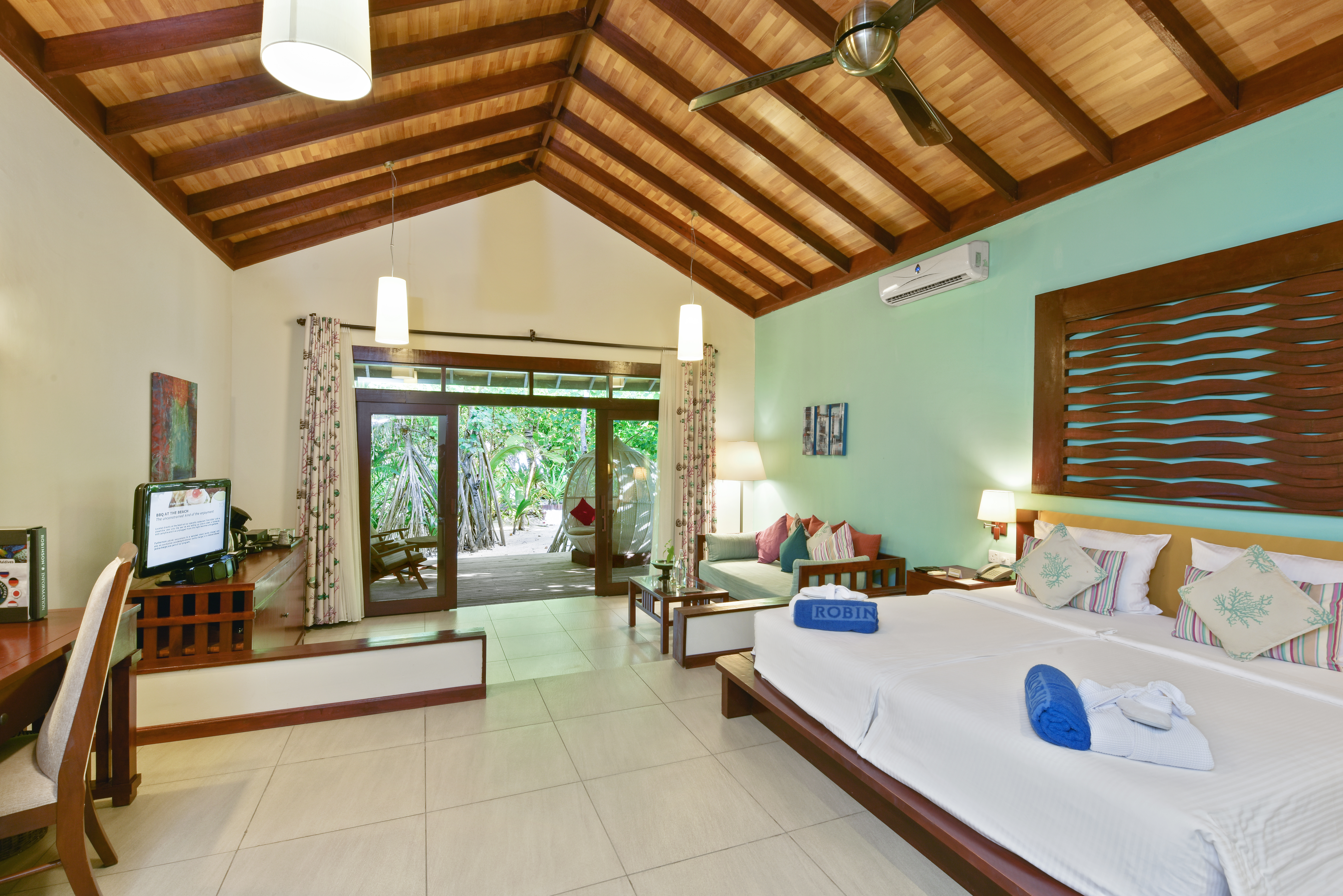 房型介绍:座落在水边,宽敞的平房可感受到海洋微风,中规中矩的沙滩屋,和卡努呼拉岛沙滩屋很类似,但价格便宜多了。所有沙滩房型前面都有低矮植被,视线要越过植被才能看到大海。