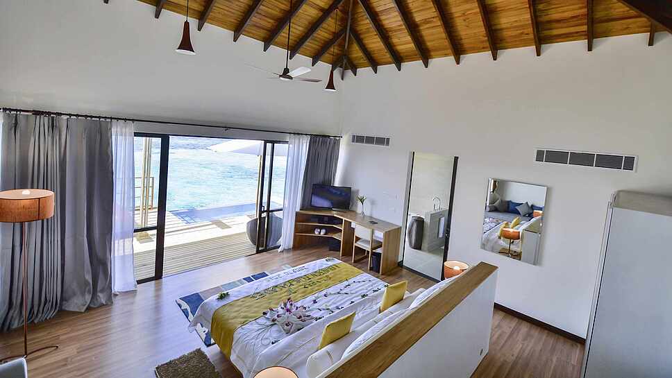 房型介绍:客人可以在房间内享受360度全景岛屿风光和被海洋而围绕的美感。开阔的空间以及更加豪华设计与设施,让客人充分的体会到最尊贵的享受。房间有两个套间的卧室,独立的生活区,增强了私密感。