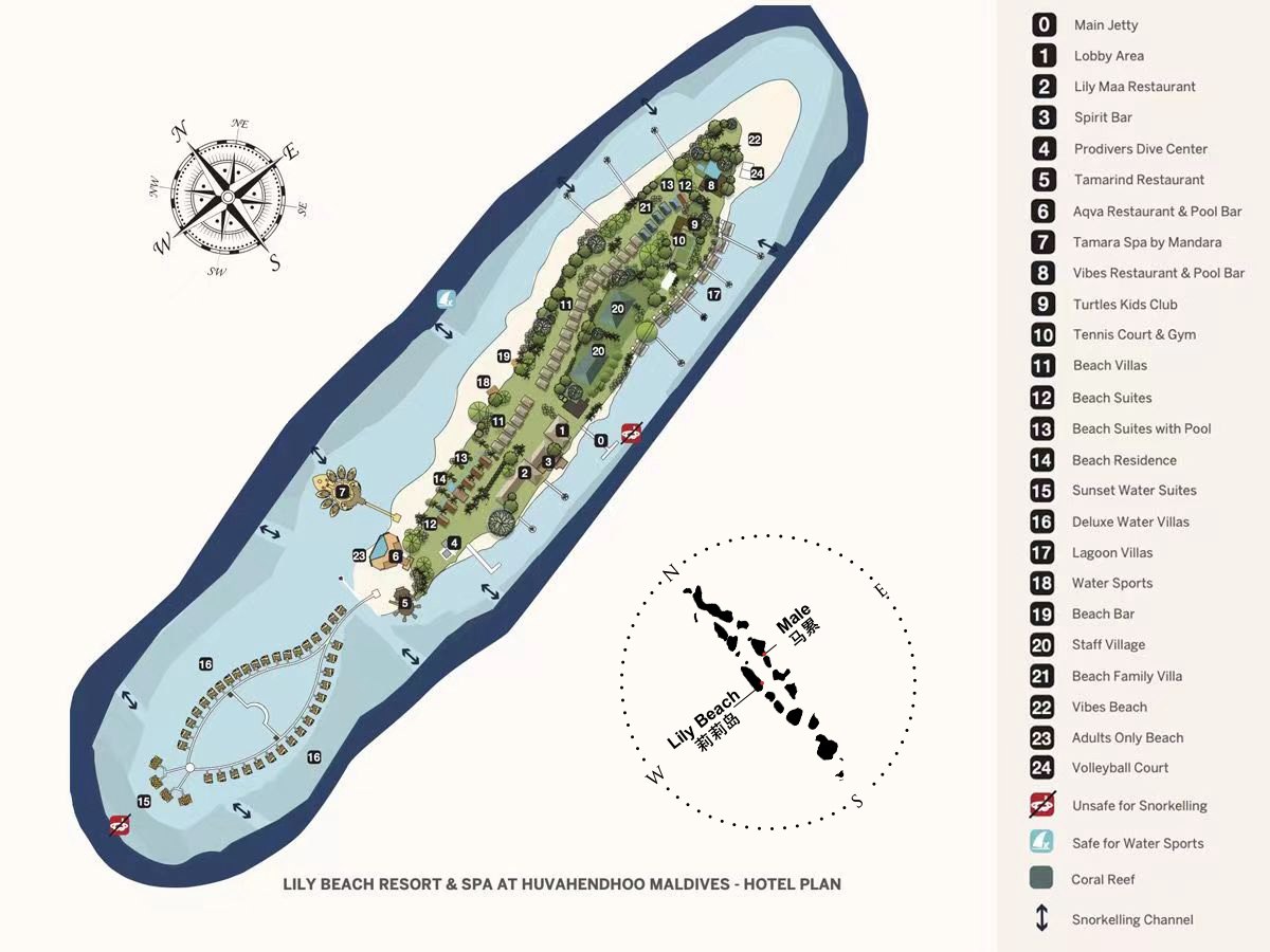 马尔代夫莉莉岛 Lily Beach Resort,位于阿里南环礁,可以乘坐水上飞机或内陆飞机前往。2009年4月重新开业。其原始的海滩,郁郁葱葱的热带植物和异国情调的房型距离岸边仅数米。壮观的阿里环礁拥有世界上的一些接近的最令人惊奇的潜水地点有利位置。岛屿周围的珊瑚礁环绕成独特的形状,清澈的海水与银白的沙滩交相辉映,葱郁的热带植物与蔚蓝的天蓝相映成趣,为客人们提供一处休闲和度假的理想天地。莉莉岛不仅时髦,而且是属于为数不多的高性价比豪华度假村。作为曾经全包岛的鼻祖系列岛屿,也是曾经全包的顶级岛屿。