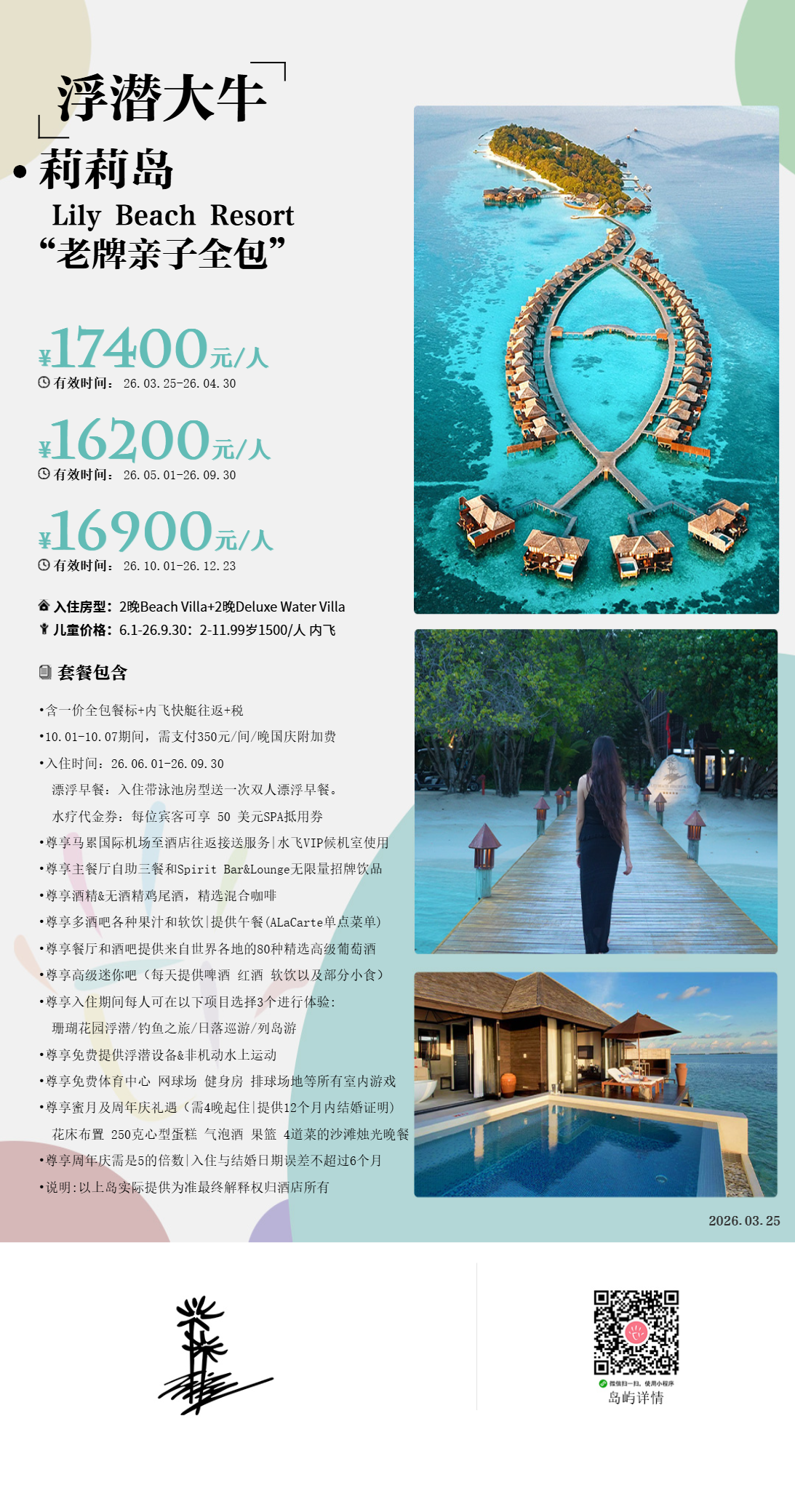 房型介绍:136㎡的海滩家庭别墅,全岛5栋,离诱人泻湖礁仅仅几步之遥,靠近岛上的活动设施,这些相互连接的别墅让您感觉到大部分的时光都可以在这个小天堂里度过。
