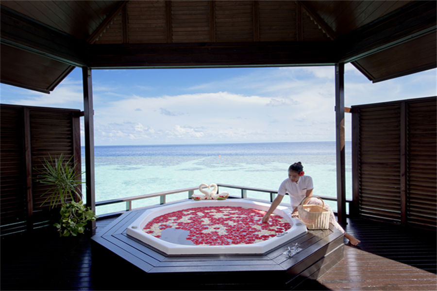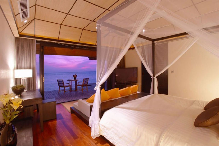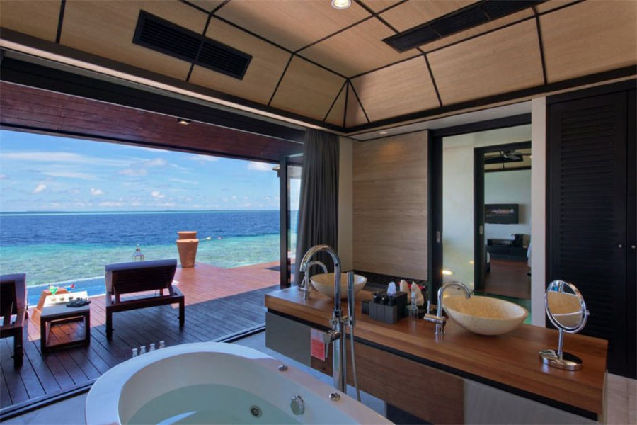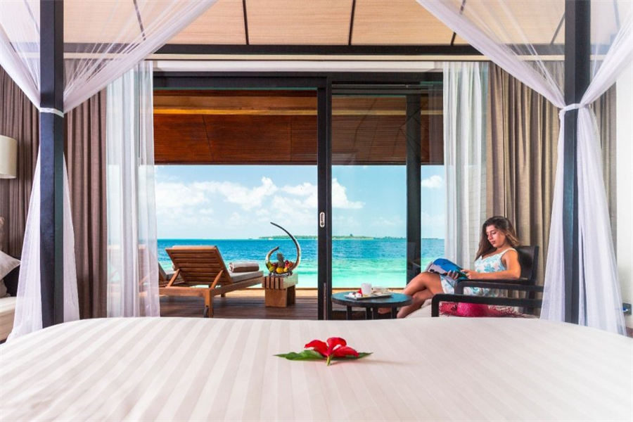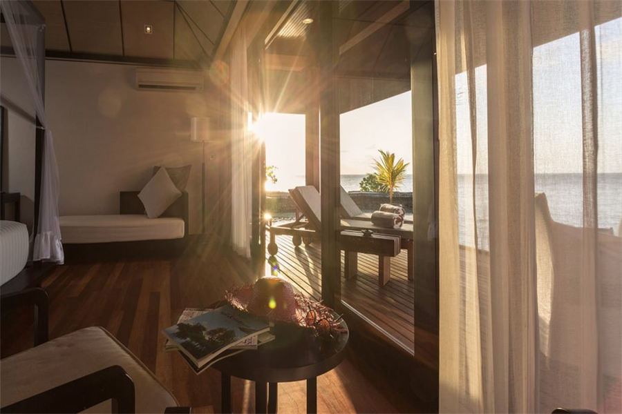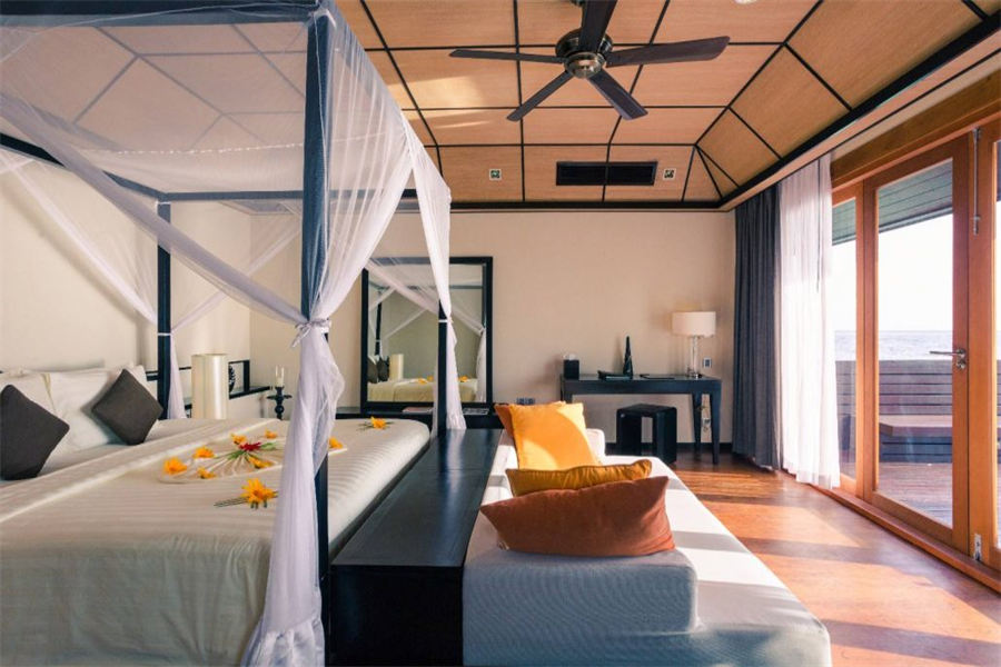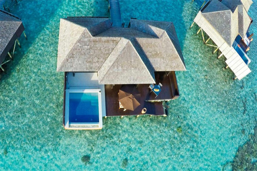 房型介绍:126㎡的豪华水上别墅,全岛36栋。别墅提供一览无遗的蓝色,为您提供一个真正的五星级豪华体验,距离珊瑚礁群仅有数米,与惊艳珊瑚礁石间浮潜邂逅过后,您可以在您的私人阳台上放松,或在按摩浴缸水池里消暑。