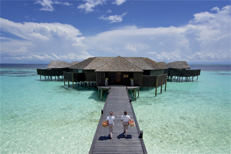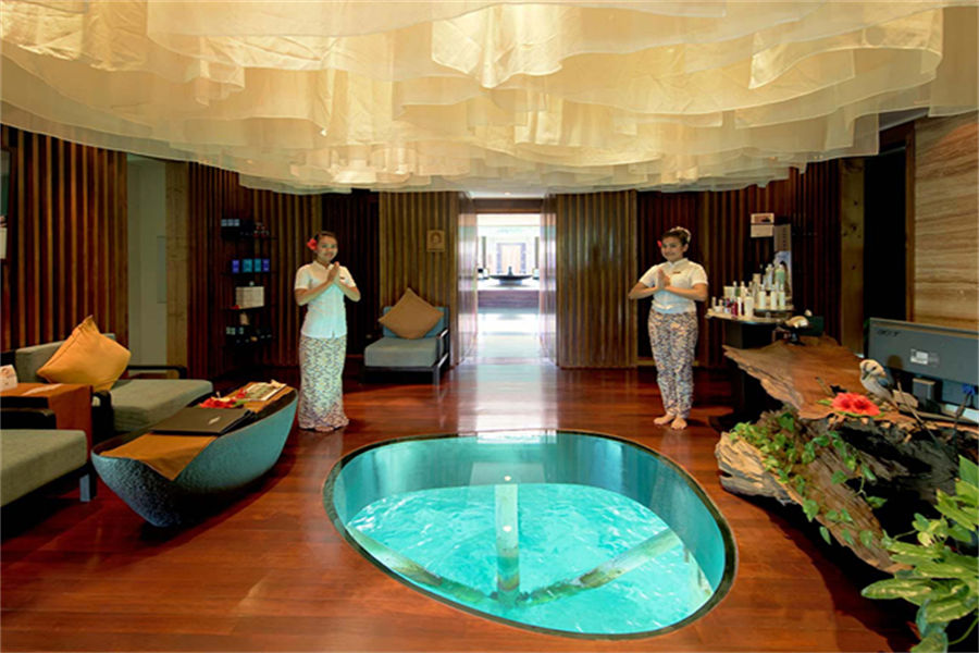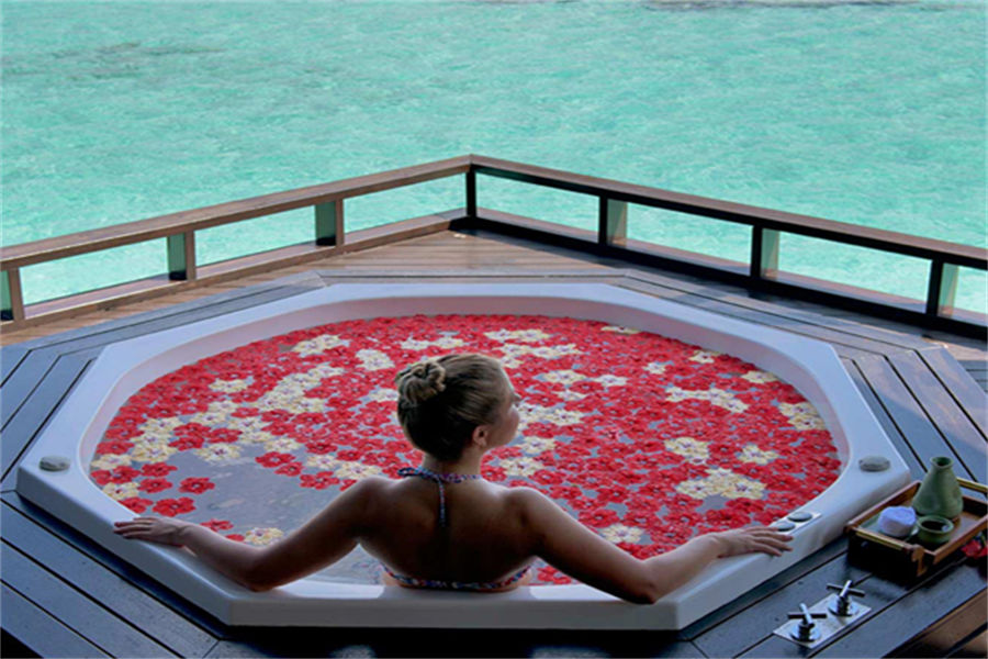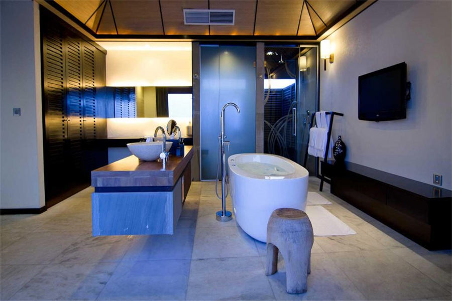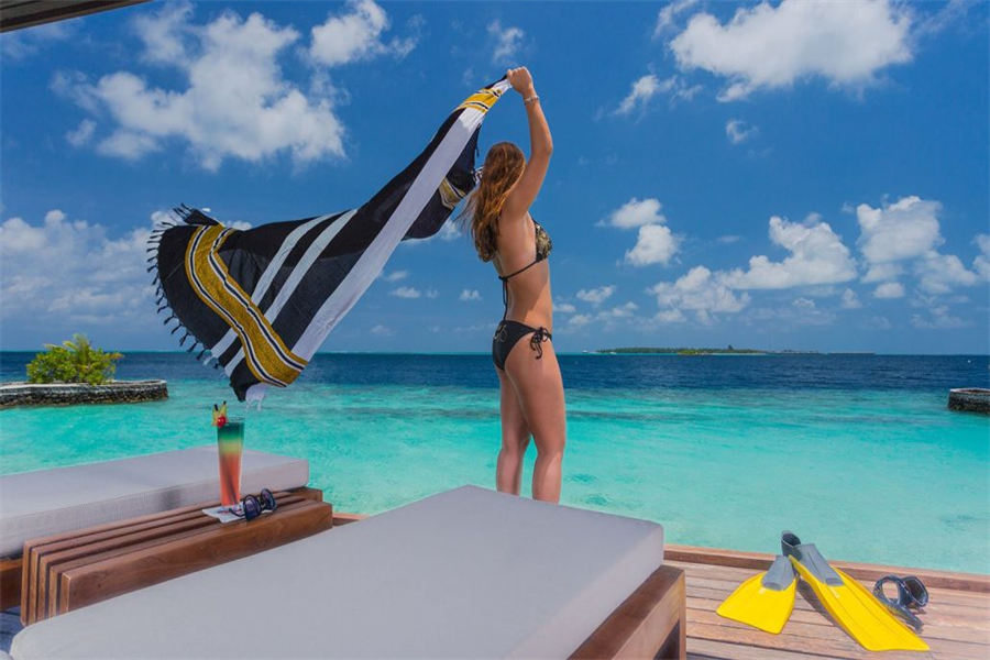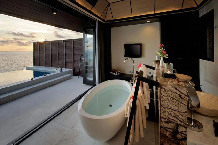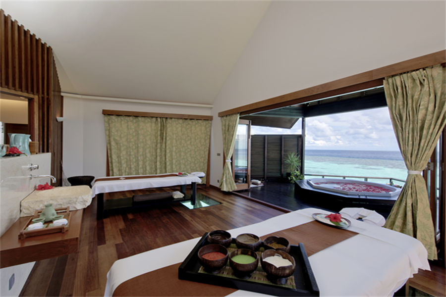 房型介绍:126㎡的豪华水上别墅,全岛36栋。别墅提供一览无遗的蓝色,为您提供一个真正的五星级豪华体验,距离珊瑚礁群仅有数米,与惊艳珊瑚礁石间浮潜邂逅过后,您可以在您的私人阳台上放松,或在按摩浴缸水池里消暑。