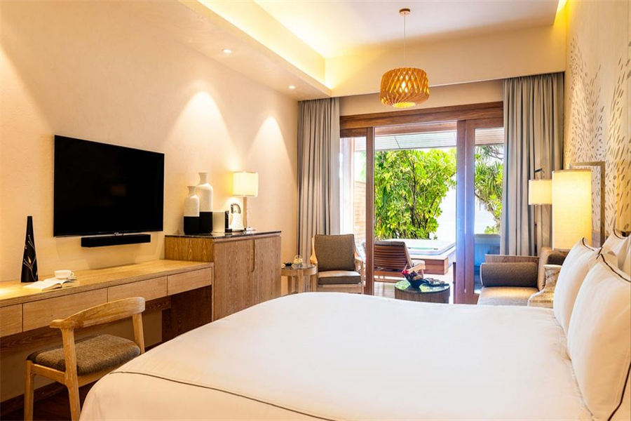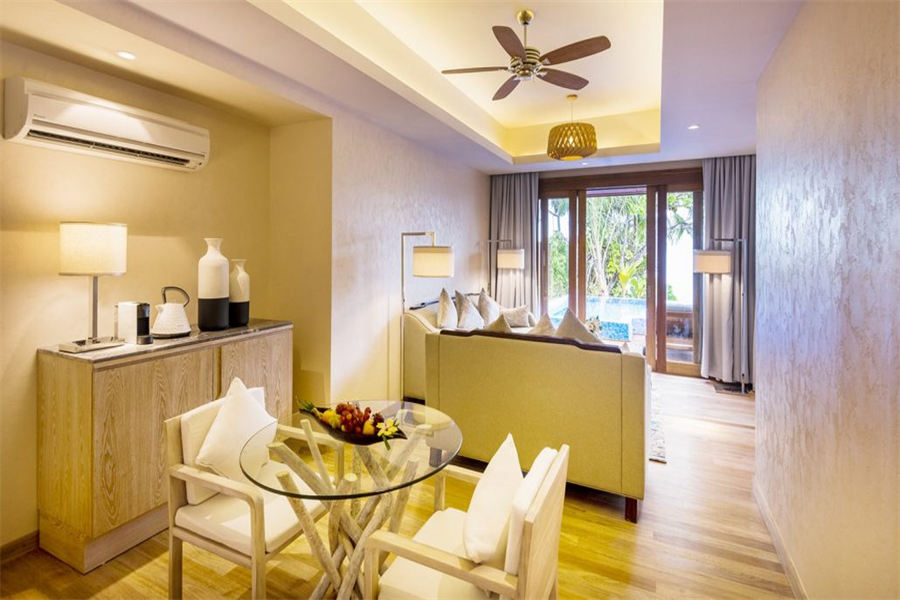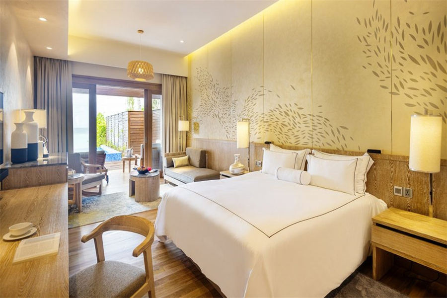 房型介绍:225㎡的海滩泳池住宅,全岛仅1栋。这座别墅藏在海滩上,毗邻印度洋的碧绿水晶水,拥有充足的空间主卧室设有自己的连通浴室,客厅区可直接通往室外甲板和大型游泳池,距离海滩仅几步之遥。对于那些寻求极致奢华和完全私密性的人来说,海滩泳池住宅是僻静,宽敞,豪华的海边之家。