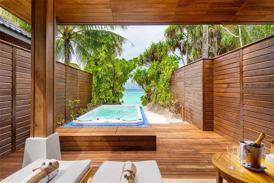 房型介绍:76㎡的带按摩池的海滩套房,全岛4栋,是浪漫度假或家庭度假的理想场所。套房沿着沙滩,门直通带私人按摩浴缸的甲板,可以直接通往大海。室内设计现代,配有现代化设施和豪华浴室。